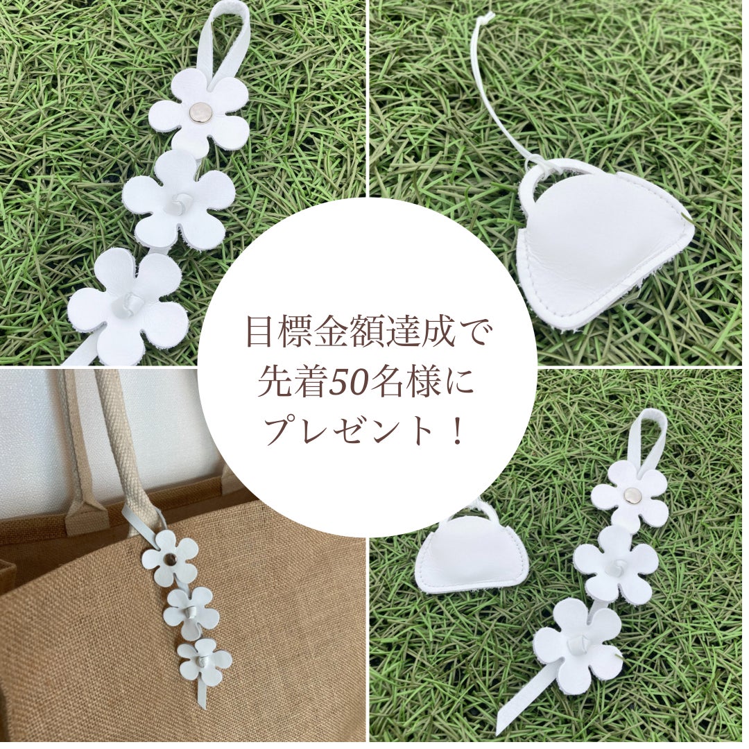 今回、初めてのプロジェクトを記念して、目標金額達成で先着50名様に兵庫県姫路産の牛革を使った、お花のチャーム&ワンコイン入れチャームをセットでプレゼントします♪