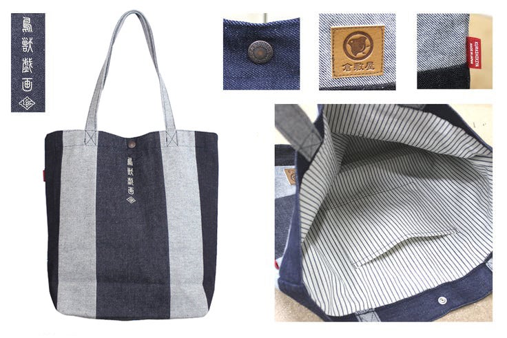 バッグの表面には、倉敷屋オリジナルの革タグ、バッグ横にはワンポイントに