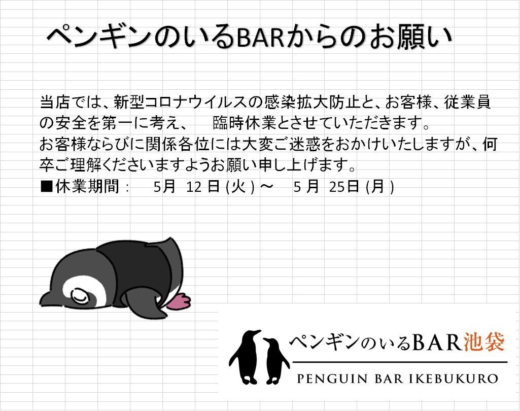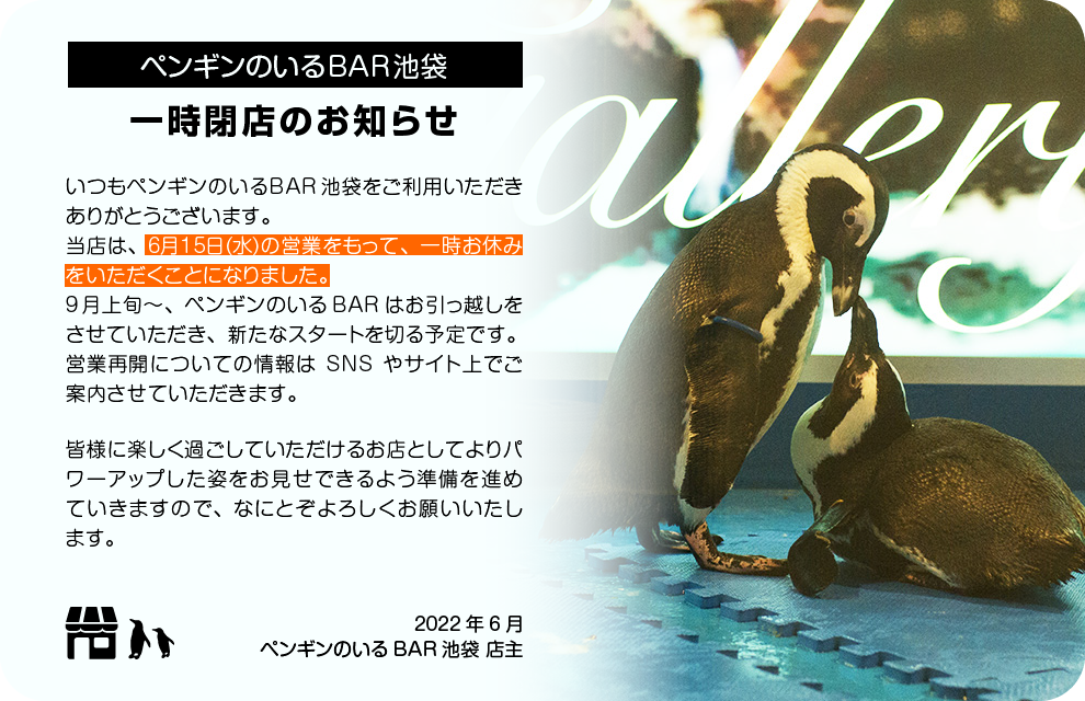 2022/06/02 17:17【ご報告】この度誠に勝手ながらペンギンのいるBAR池袋は6/15をもって一時閉店となります。急なお知らせとなってしまい大変申し訳ございません。9月頃に場所を移転しまして心機一転リニューアルオープンとなります。その為に工事期間の営業はございません。新たな場所は追ってご報告いたします。なお、ペンギンさんたちは縁ある水族館のほうで一時預かっていただきますのでご安心ください。これを機会に、ペンギンさん、社員一同一層専念いたしますので、今後とも変わらぬご愛顧を賜りますようお願い申し上げます。リターンにつきましては新店舗の方でもできる限りの対応をさせていただきますので引き続きよろしくお願いいたします。質問等ございましたら info@penginbar.jp もしくはキャンプファイヤーのメッセージまでよろしくお願いいたします。ペンギンのいるBAR池袋 店長 もっと見る