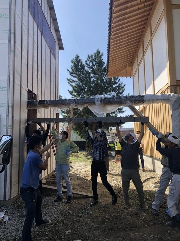 仮小屋に保管されていた輪径約2.5メートルの光背と縦約2.5メートルの台座を運び出すため、仮小屋の入り口の高さを拡大して作業を行いました。
