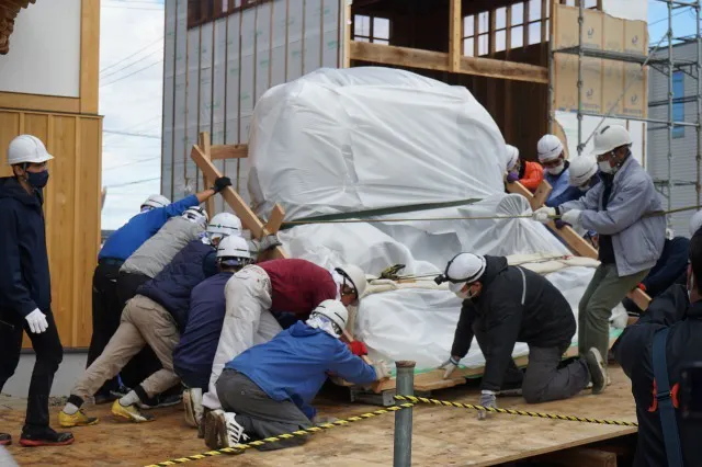 頭部抜きでも400kgほどの重量が見込まれ、また修復で補強したとはいえ工業製品のように頑丈なものでないので、都度確認しながら慎重におこなわれました。