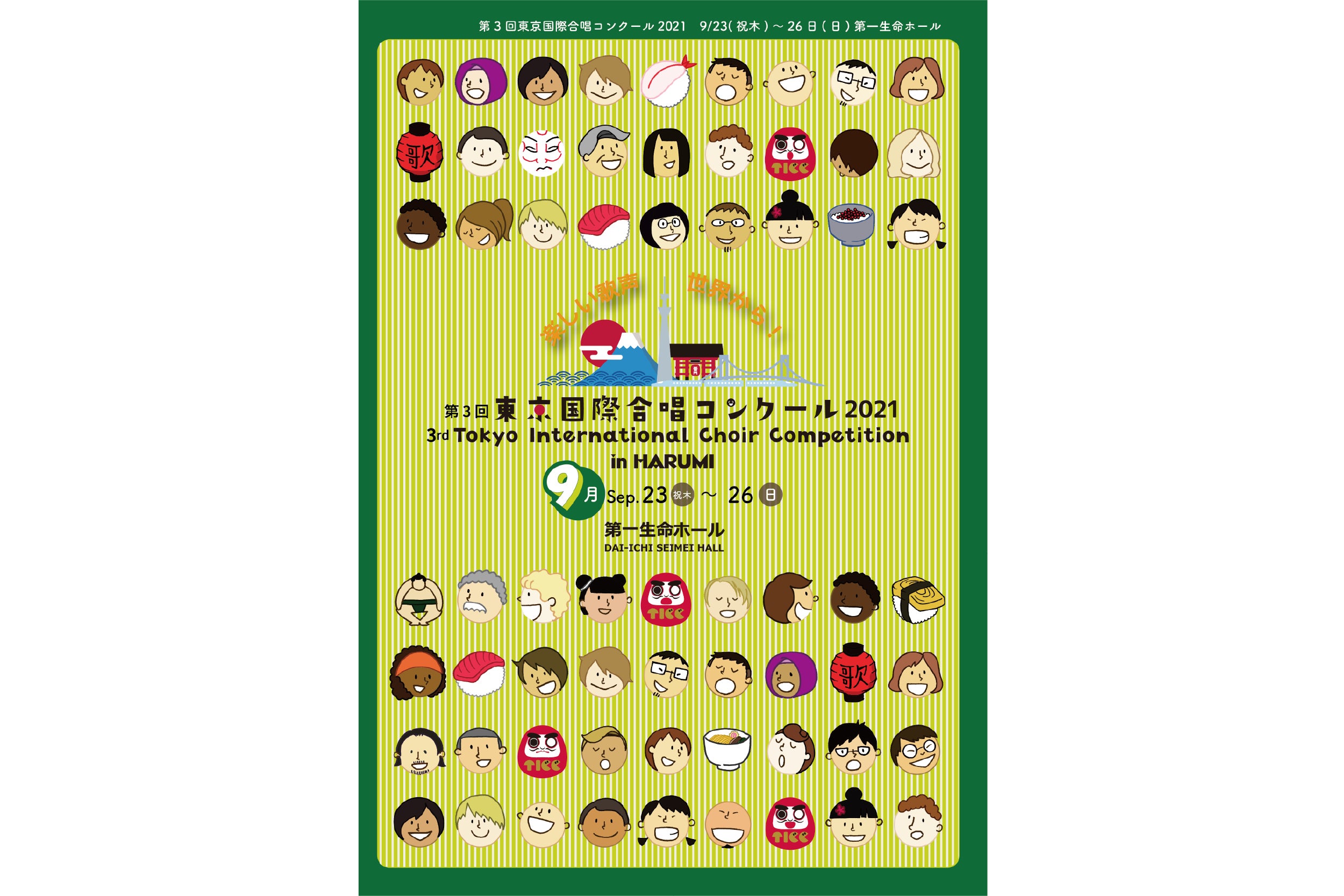 今年9月23日(木祝)~26日(日)には、東京都中央区・第一生命ホールにおいて『第3回東京国際合唱コンクール』を開催する予定です。今年も世界中から数多くの合唱団が応募して下さいましたが、新型コロナウイルスの影響で、残念ながら来日できない合唱団もあるといった現状です。また、来日予定の合唱団や国際審査員も、新型コロナウイルスの影響で様々な制限に直面するため、大きな負担を強いられるといった現状もあります。