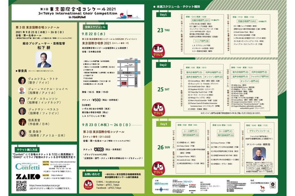 今年のTICCを第一生命ホールでご覧になれる3日間のペアチケットです!素晴らしいホールでTICCを満喫することができます♪チケットは当日ホールにてお渡しさせていただきます。なお、ご来場に関わる費用(交通費・宿泊費等)はご自身でご負担ください。