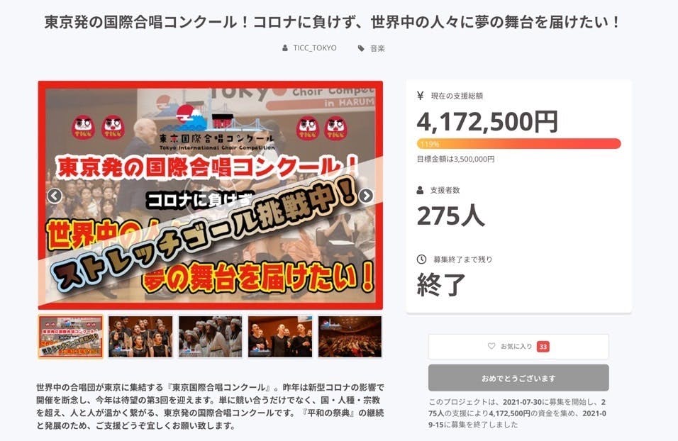 2021/09/16 22:00こんばんは。東京国際合唱コンクール実行委員会です。昨日9/15(水)をもって、当プロジェクトは募集終了となりました。7/30(金)からの48日間で、275名の皆様から4,172,500円のご支援をいただき、当初の目標金額の119%を達成することができました!このプロジェクト、そして『東京国際合唱コンクール』のために、これまでご支援・ご協力いただきました皆様に、改めまして心より感謝申し上げます。『第3回東京国際合唱コンクール』の開催まで、残り1週間となりました…!皆様の心温かいコメントから沢山のエネルギーをいただき、実行委員会一同、ラストスパートを掛けております。今回は入場チケットだけでなく、世界中どこからでもお楽しみいただけるオンラインチケットもご用意しております。★詳しくはこちら★https://www.ticctokyo.icot.or.jp/3rdticket一言では表すことができない、あの感動を、一人でも多くの皆様と共に分かち合えましたら幸いです。引き続き、どうぞ宜しくお願いいたします。実行委員会一同 もっと見る【スタッフが語るTICC:その3】まちかどコンサート