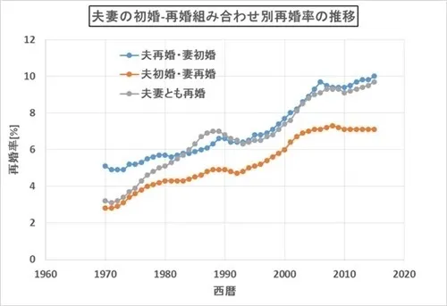 また再婚率についても変化が見られます。再婚する際お相手も離婚経験者を選ぶ傾向にあることが下のグラフからわかります。このままだと再婚女性が初婚男性と結婚することは現状維持もしくは下降する恐れまであります。そこでこのサービスを利用すれば再婚同士の結婚も、初婚男性との結婚もでき全体の再婚率を上昇させることが期待されます。