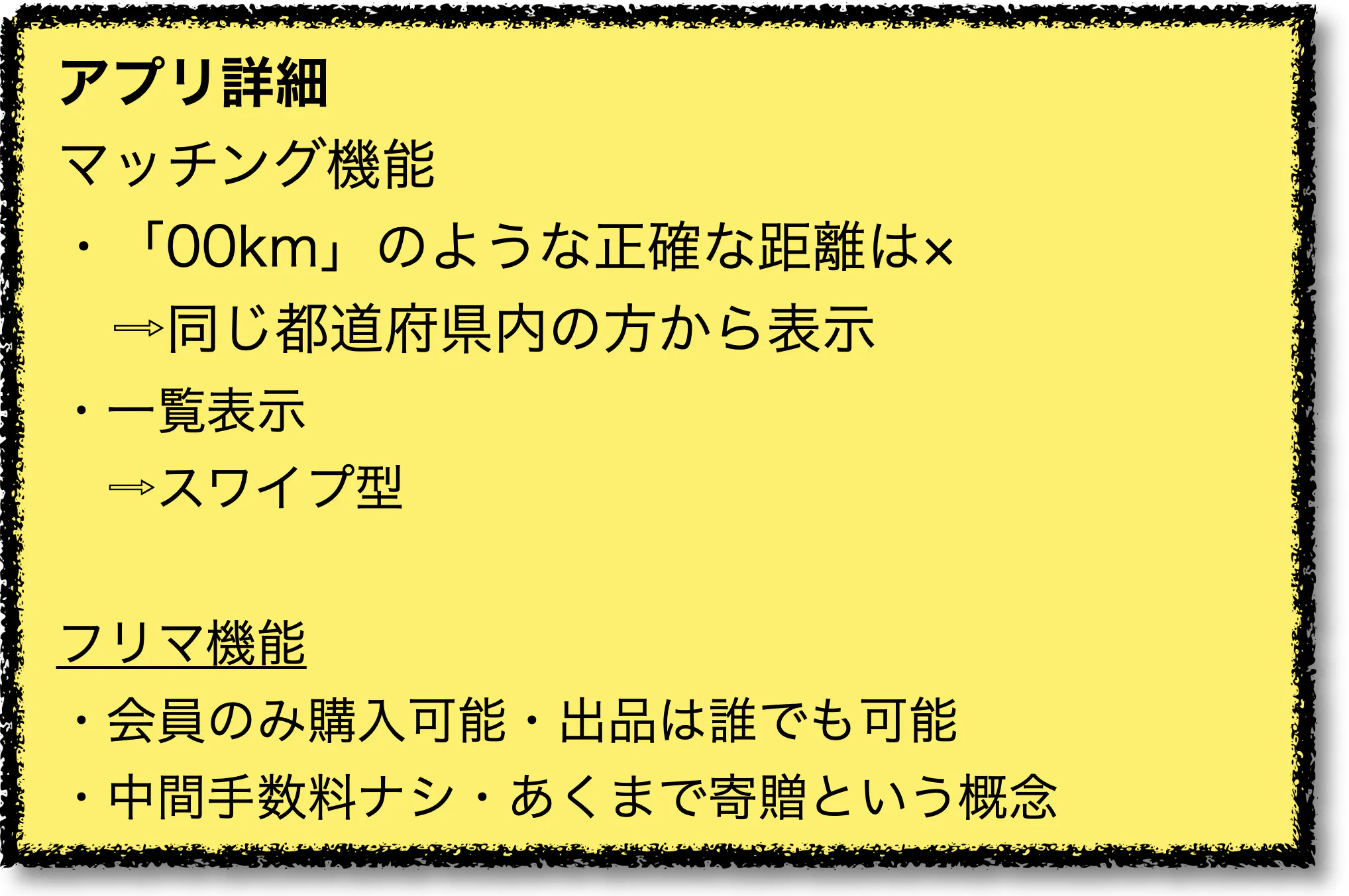 利用者の体験・プライバシーを最優先させます。「00km」は距離が表示されるため不採用とします。記入欄には「近くに親族はいるか・同居を希望・出産の希望」(任意)などを記入して頂こうと思います。ご利用動作は開発段階ですがスワイプ型を採用しようと考えています。使い慣れた仕様の方が違和感なくご利用していただけると考えました。