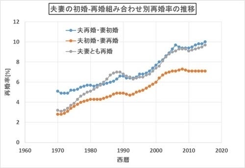 また再婚率についても変化が見られます。再婚する際お相手も離婚経験者を選ぶ傾向にあることが下のグラフからわかります。このままだと再婚女性が初婚男性と結婚することは現状維持もしくは下降する恐れまであります。そこでこのサービスを利用すれば再婚同士の結婚も、初婚男性との結婚もでき全体の再婚率を上昇させることが期待されます。