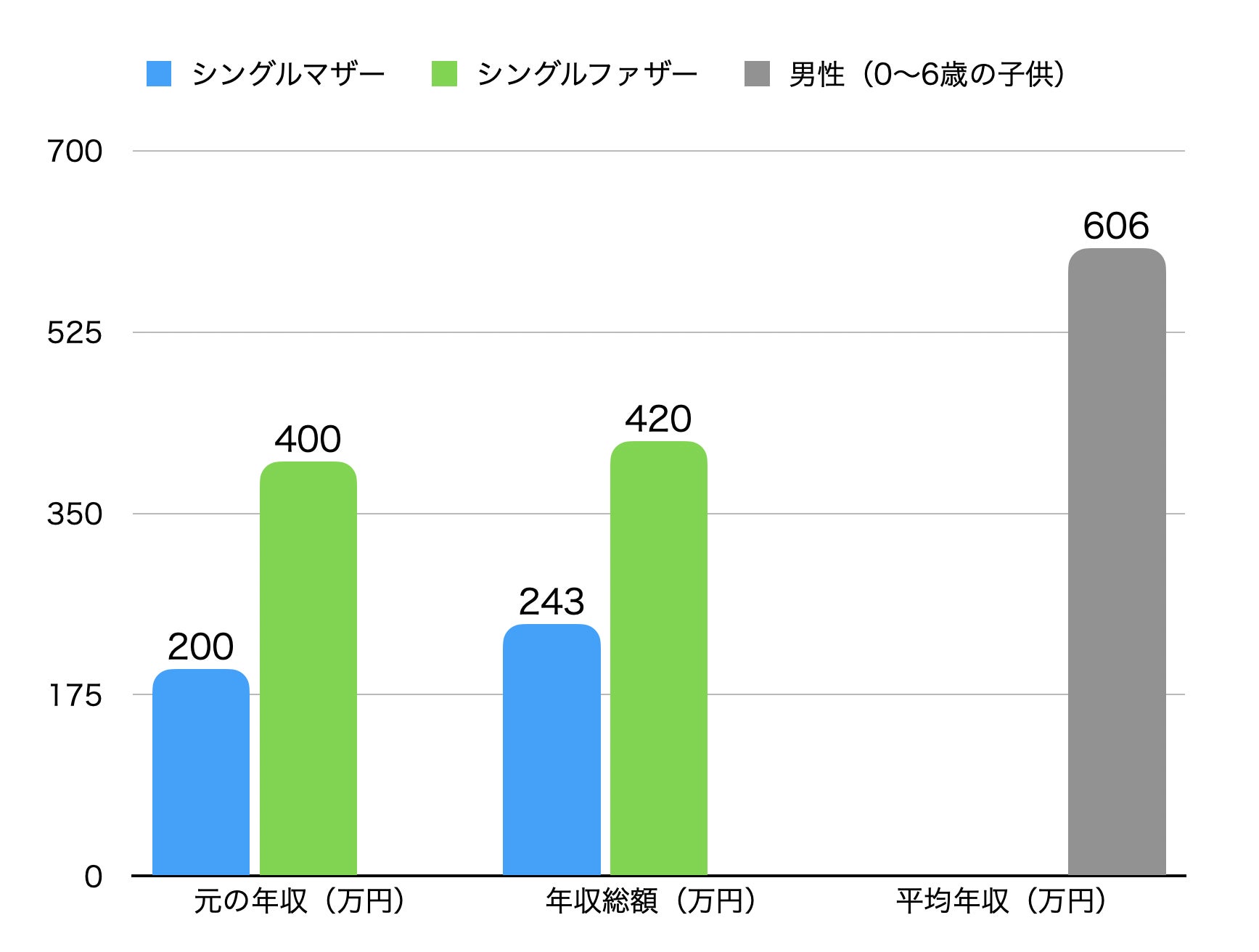 皆さんはシングルマザー・シングルファザーの年収をご存知でしょうか。平成28年度のシングルマザーの年収は 「243万円」でシングルファザーの年収は「420万円」でだそう です。これには国からの手当て金も含まれています。その分を差し引くとシングルマザー 「200万円」シングルファザー「400万円」になりその差は2倍になります。