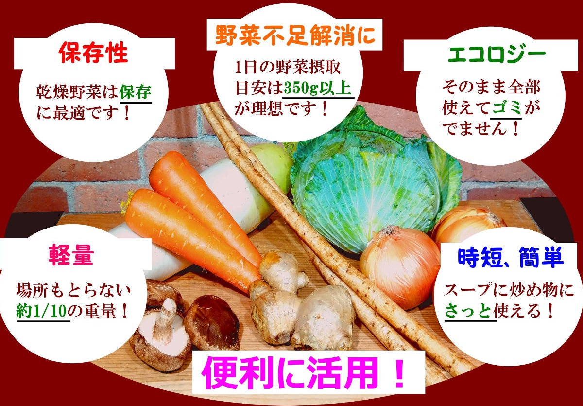 どうしても買い物にいけない、+1品欲しい、非常食として、時間がない時でも、こんなにメリットがある乾燥野菜を是非、ご賞味ください!