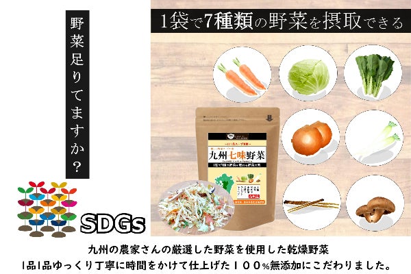 それは、おばあちゃんの1言でした。切干大根はなかと、1本買うと重いけん!確かに大根やキャベツなど1キロ、2キロ重量があるから沢山買えないよね!・・・まてよ!?乾燥すると重量が軽くなるし長期保存もできる!野菜の大きさ形は関係ない!味は変わらないのだから!!それから1年間かけて30種類以上の野菜を乾燥し試作と実験(乾燥時間、温度、湿度、含水率、カットサイズ)など試行錯誤を繰り返し生まれたのが九州七味野菜です。