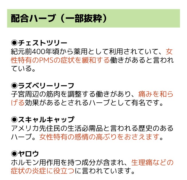 月経前症候群や月経周期に伴う症状に効果があると言われているチェストツリーを中心に、月経などの子宮活動のサポートをしてくれる、ラズベリーリーフやヤロウなどを配合しています(月経前症候群の症状や月経周期と関連する症状に有効である結果が示唆されています)。