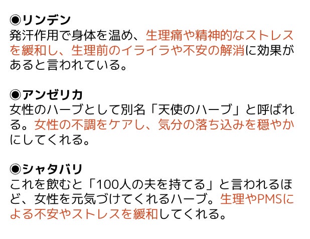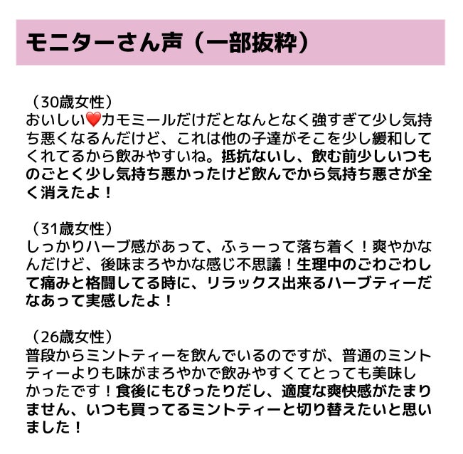 ・しっかりハーブ感があって、ふぅーって落ち着く!爽やかなんだけど、後味まろやかな感じ不思議!生理中のごわごわして痛みと格闘してる時に、リラックス出来るハーブティーだなあって実感したよ!(31歳女性)