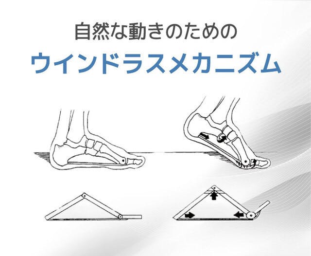 高反発サンダル『エアーズ』は 素材工学と3Dシミュレーションによって、サンダルのウィンドラスメカニズム(足の甲を押さえつけない)を実現しました。