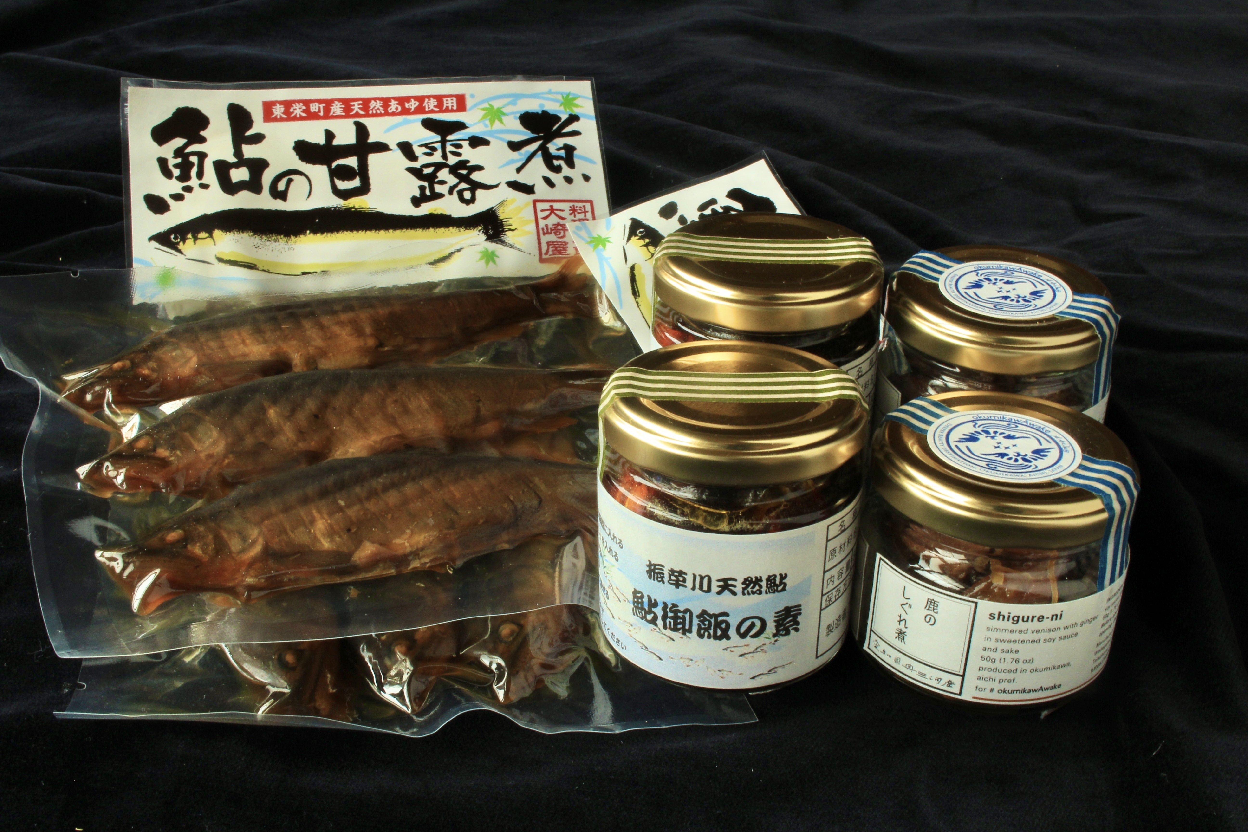 ① 5,000円 振草川産天然鮎の甘露煮、鮎御飯の素、奥三河産鹿のしぐれ煮の各二個セット