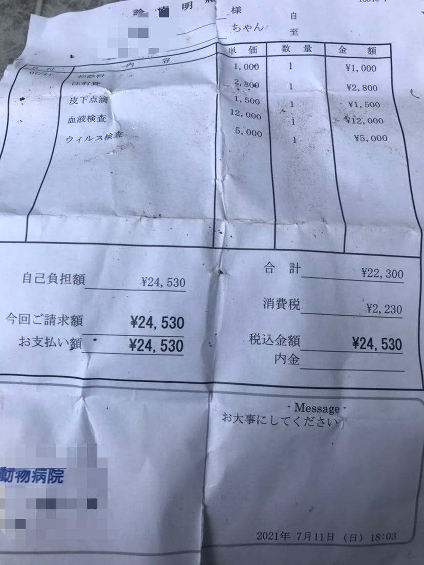 診察、血液検査、点滴、栄養剤注射、インスリン注射をしました。