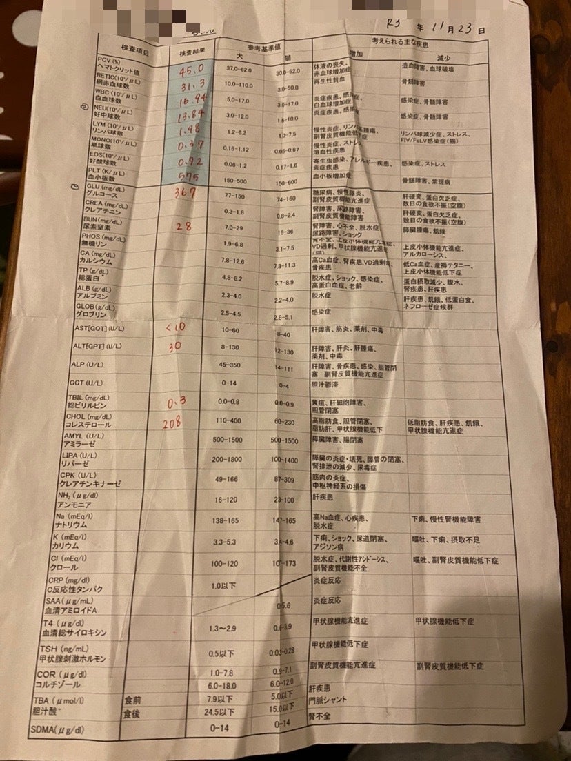 最近は比較的おとなしくしていたので油断していて、わたしの不注意でキッチンの上に置いてあった食べ残しを少し食べられてしまいました。翌朝、まったくドライフードを食べなくなってしまい、具合も悪そうだったので病院へ連れて行きました。血液検査の結果は特に問題なく、お腹に物が入っているから食べないか、お腹の調子がよくないから食べないのどちらかだと思いますと言われました。1日様子を見て、しっかり下痢便をし、翌朝はいつもの食欲が戻りました。その後キッチンの上に乗るようになってしまったので、食べ物を置かないように以前よりも注意しています。この日は血液検査のほかにインスリンも購入しています。