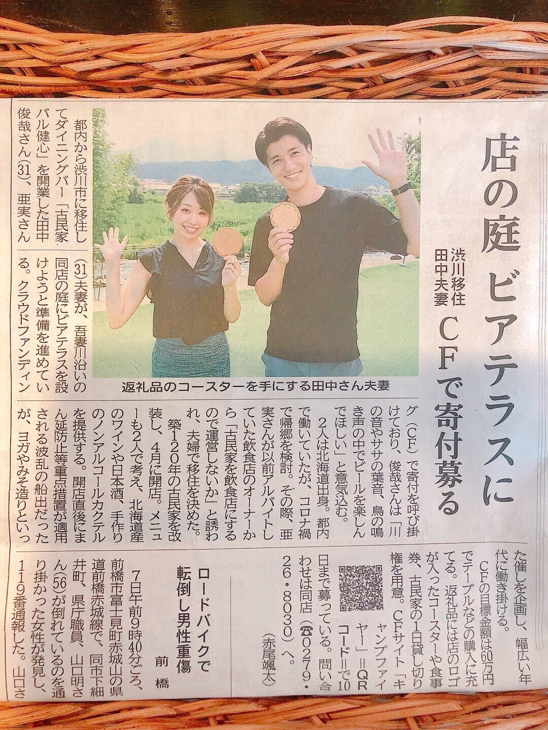 2021/08/10 15:37皆様、大変申し訳ございません。昨日活動報告欄にて、支援最終日とお伝えしましたが、正しくは本日でした。昨夜の夜中12時になり妻と「あと少しで目標額だったけど惜しかったね。」と言ってたらなんと’’残り23時間’’との表示が、、、、、馬鹿な夫婦でお恥ずかしいです。。。ということで残り約8時間ばかりですが、本当にあと少しで目標額に達成することができます。ここまで多くの皆様にご支援頂くことができて本当に嬉しく思うのと同時に目標達成し皆様と喜びを分かち合えれば幸いです。最後までどうぞよろしくお願いいたします。※写真は上毛新聞に載せて頂いた記事です。上毛新聞からの反響が多く、多く読まれているんだなと感じました。大きく取り上げて頂きましてありがとうございました!! もっと見る