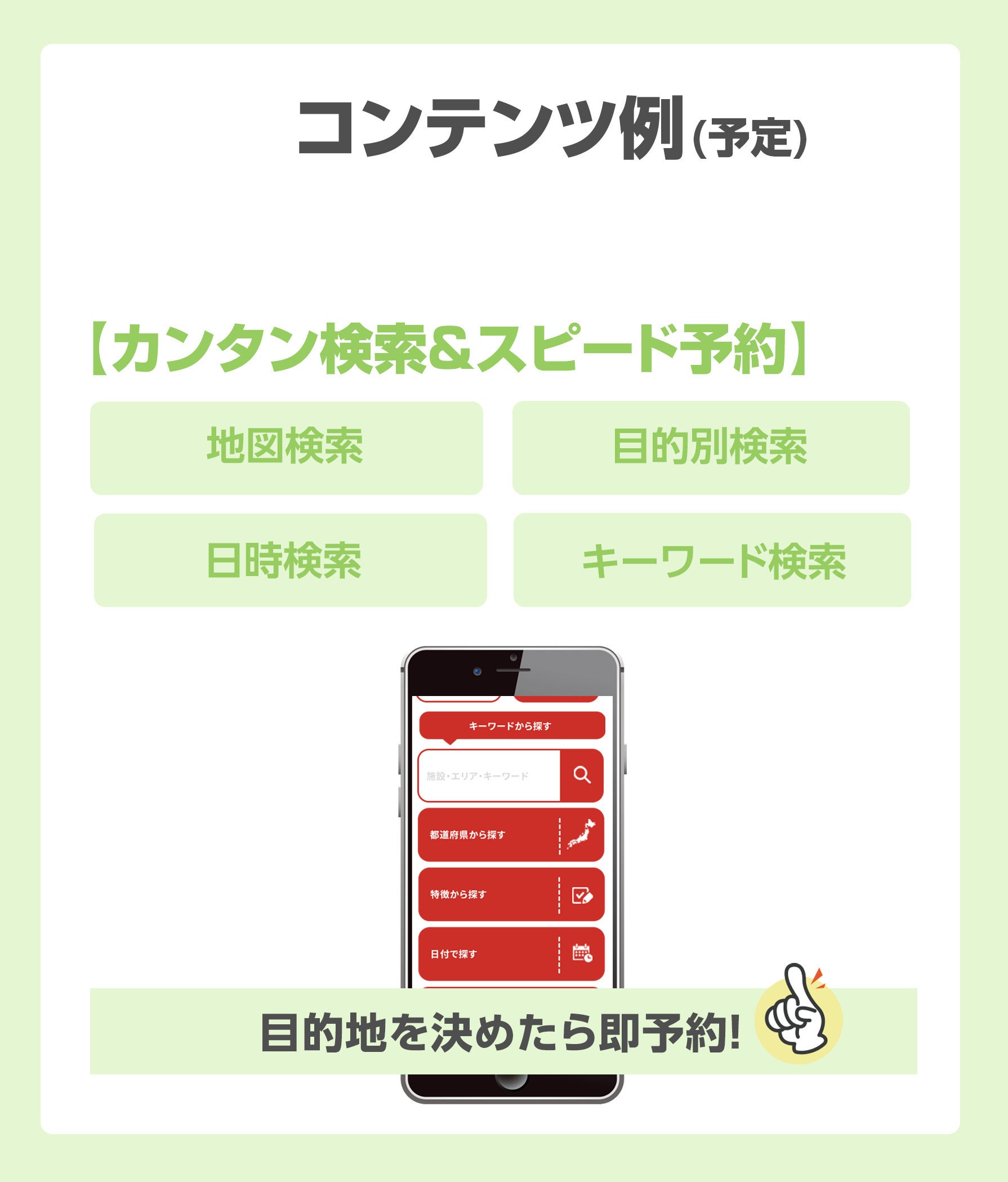 地図検索/目的別検索/日時検索/キーワード検索の4つの方法で登録キャンプ場を検索し、目的地を決めたらすぐに予約できます。予約が取れないイライラを解消します。