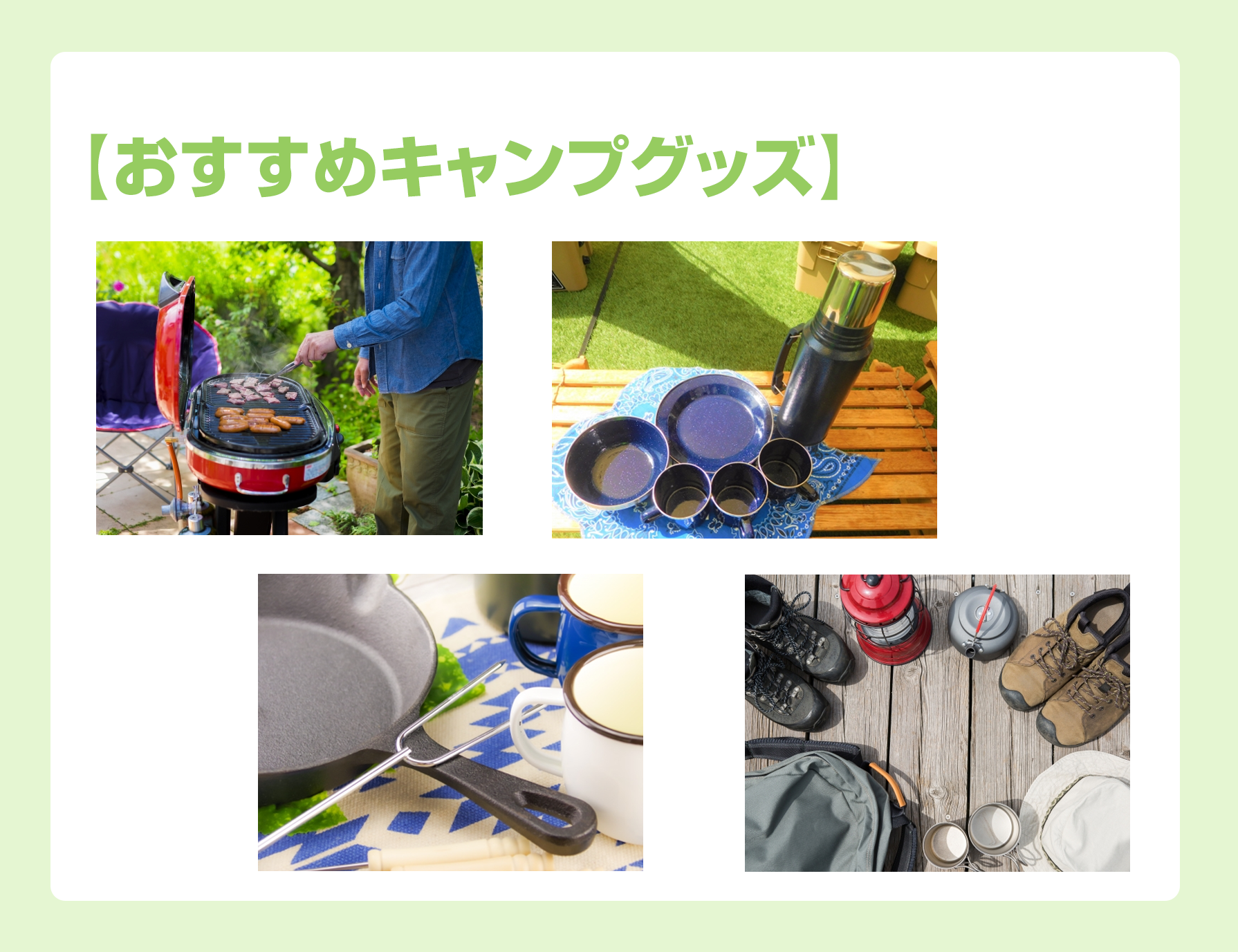 キャンプの必需品をはじめ、コレを持って行くと楽しめるというアイテム・経験談をご紹介します。