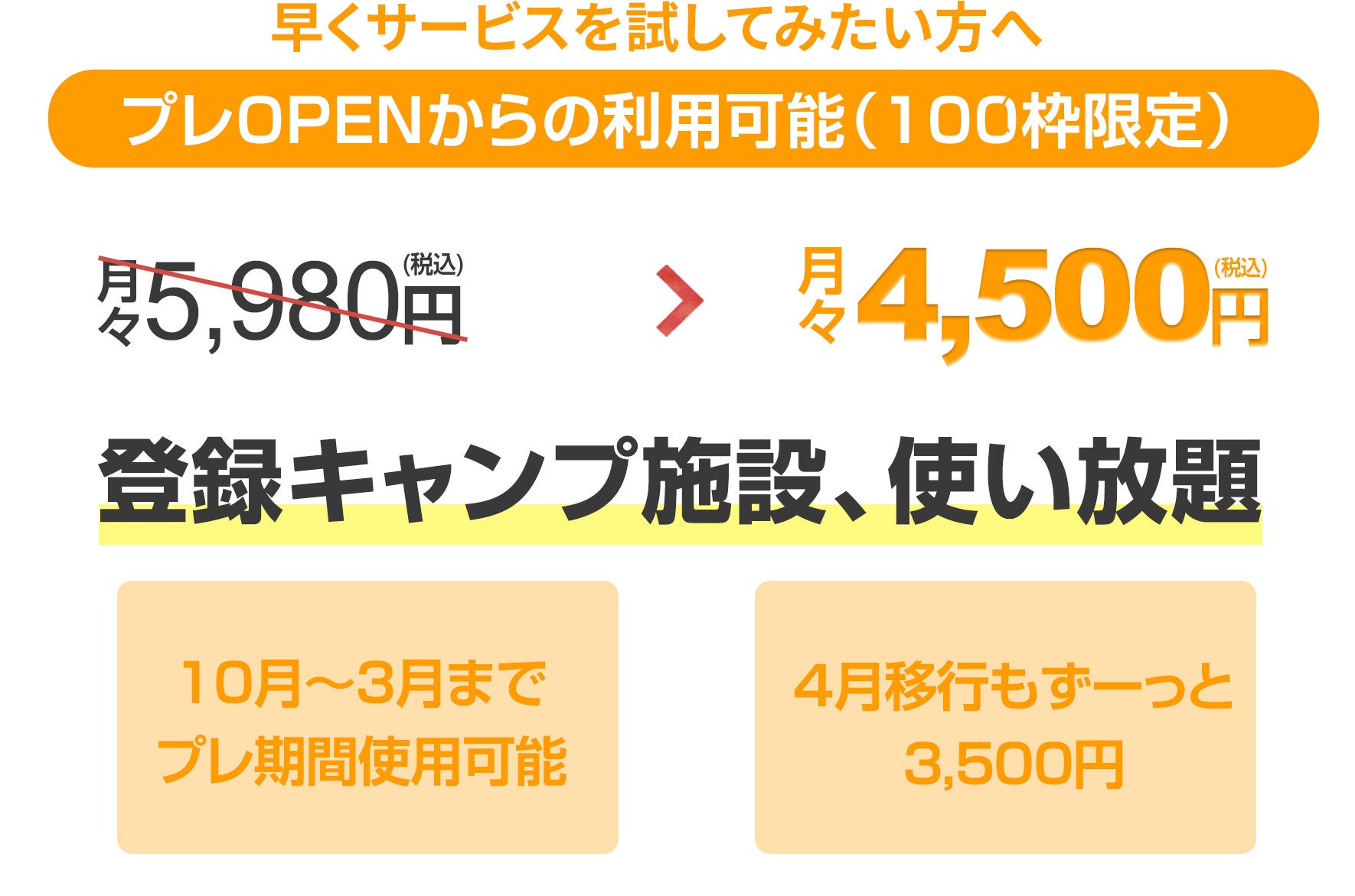 こちらのプランは100枠限定とさせていただいておりますが、稼働は抽選で50名様を対象とさせていただきます。抽選に漏れた方のご利用開始はグランドOPENの2022年4月以降となりますが、登録中は4,500円でご利用いただけます。
