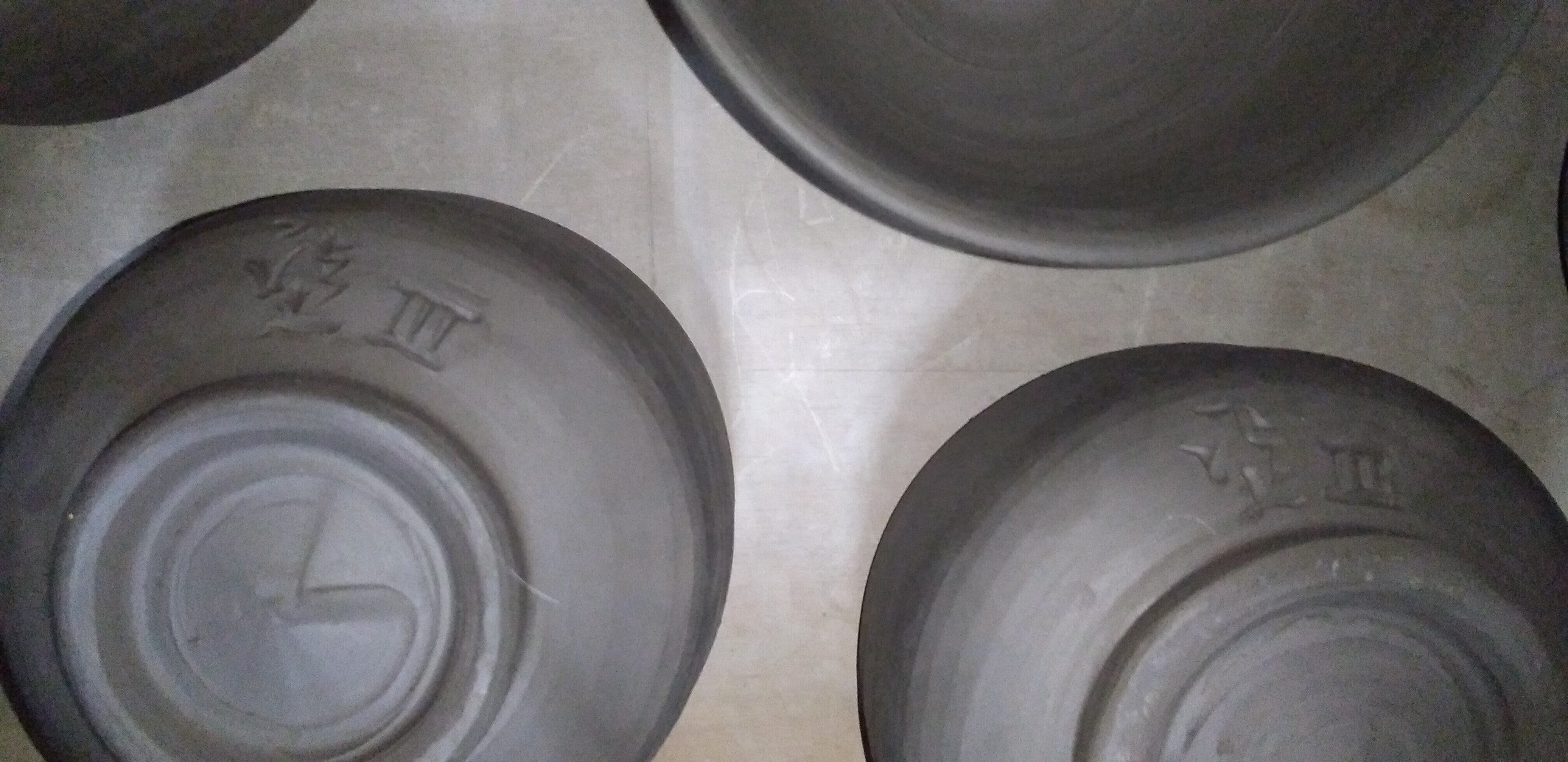 今回焼成する作品には、初窯焼きを記念して限定の刻印(サイン)をお入れします。私の名前の一字「基」を取り、今回は私には3回目の初釜となるので「Ⅲ」を組み合わせ「基Ⅲ」とお入れします。今後の予定ですが10月頃空焚きを行い、10月の中旬から窯詰めに入ります。3週間位かかります。窯焚きは11月の10日前後から約2週間で終わり、10日間冷まして窯出しです。その後、窯出しした作品をペーパー等で仕上げ、水漏れ検査(3週間位)を行います。