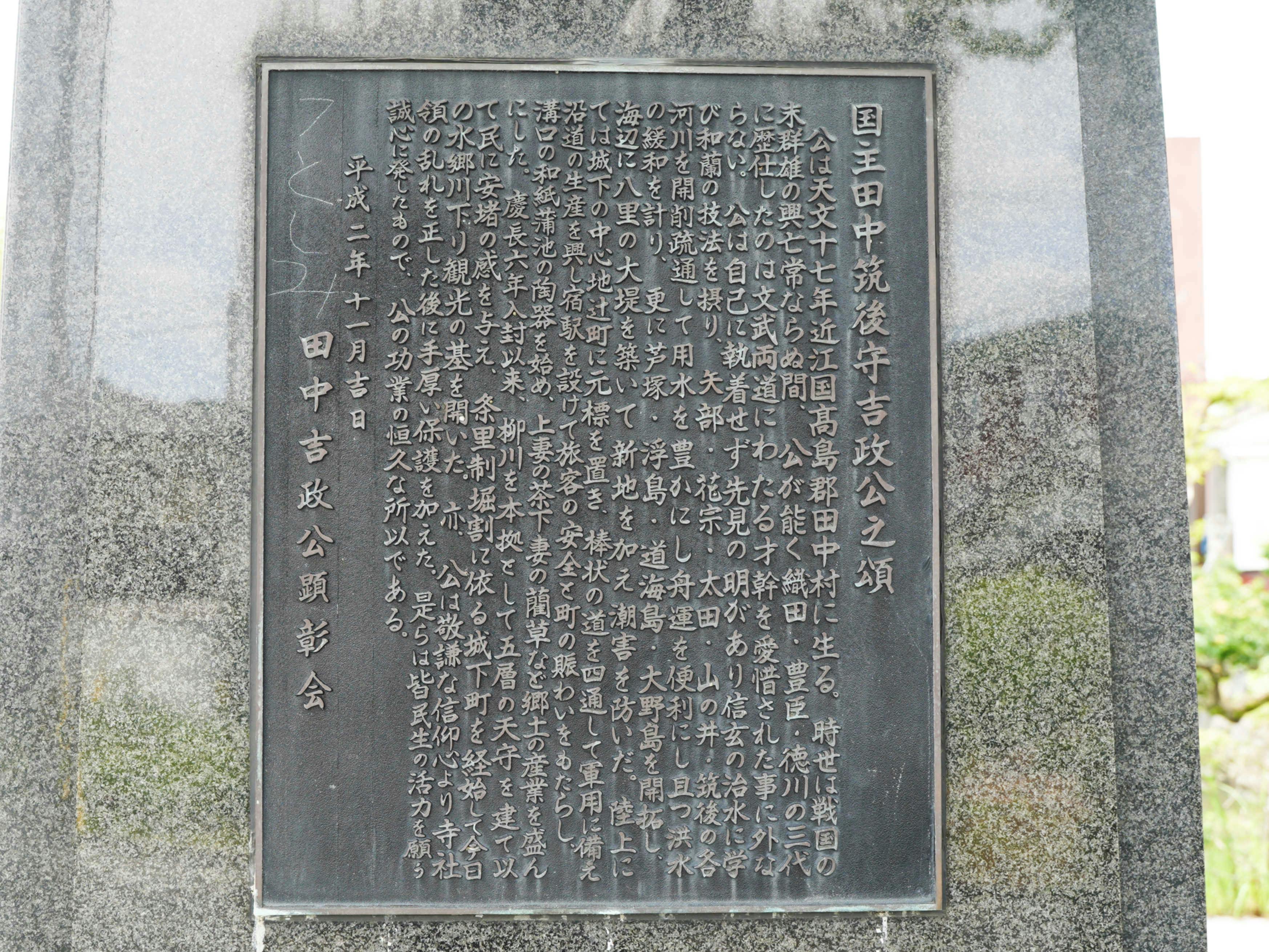 関ケ原の戦いでは、東軍に属した田中吉政。石田三成を捕らえるなどの功績を認められ徳川家康から筑後一国柳川城32万石を与えられ国持大名となりました。柳川の堀を整備し、柳川城を中心として、筑後一帯の大規模なインフラ整備をすすめ、筑後の発展に貢献した人物です。旧久留米市図書館西分館の敷地内に一部がそのまま残っている柳川往還もそのうちの1つです。