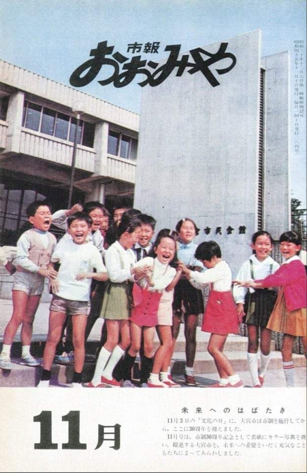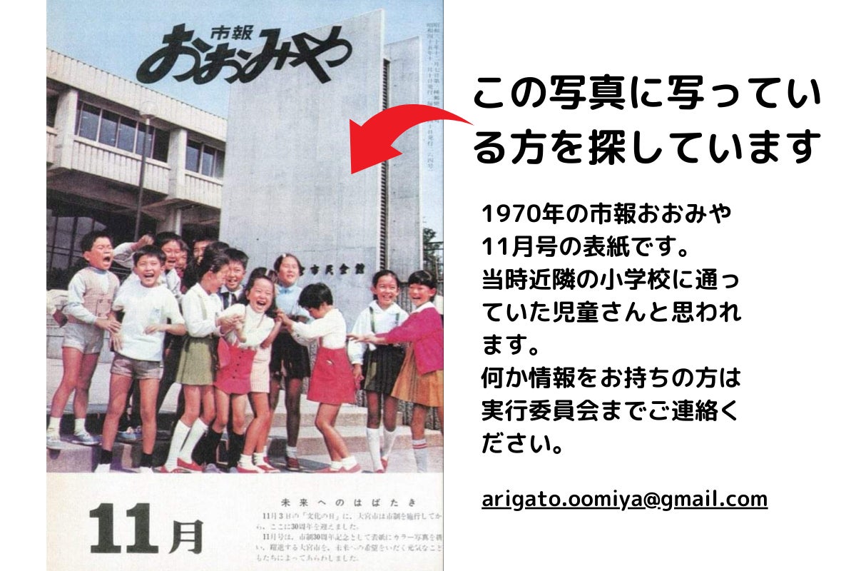 市民会館おおみや(旧名称 大宮市民会館)が完成した年の昭和45年11月10日発行の、市報おおみやの表紙です。こちらの市報の表紙に写っている方を探しています。見つかった場合は、市民会館おおみや閉館イベントにご招待し、同じ場所で写真を撮影したいと思います。何か情報をお持ちの方は実行委員会までご連絡頂けたら幸いです。