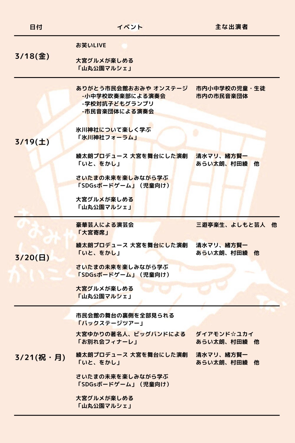 2022年3月18日~3月21日の4日間にわたり、地元さいたま市内の小中学校吹奏楽部の演奏会や大人の音楽サークルの演奏会、圧巻のビックバンドでの大演奏、大宮を舞台にした演劇・落語・お笑いLIVE、大ホールの舞台装置稼働体験ツアーや大宮のシンボル氷川神社の歴史を学ぶフォーラム、児童向けのさいたまの未来を学べるSDGsボードゲーム、大宮グルメを堪能出来るマルシェなどを開催します。