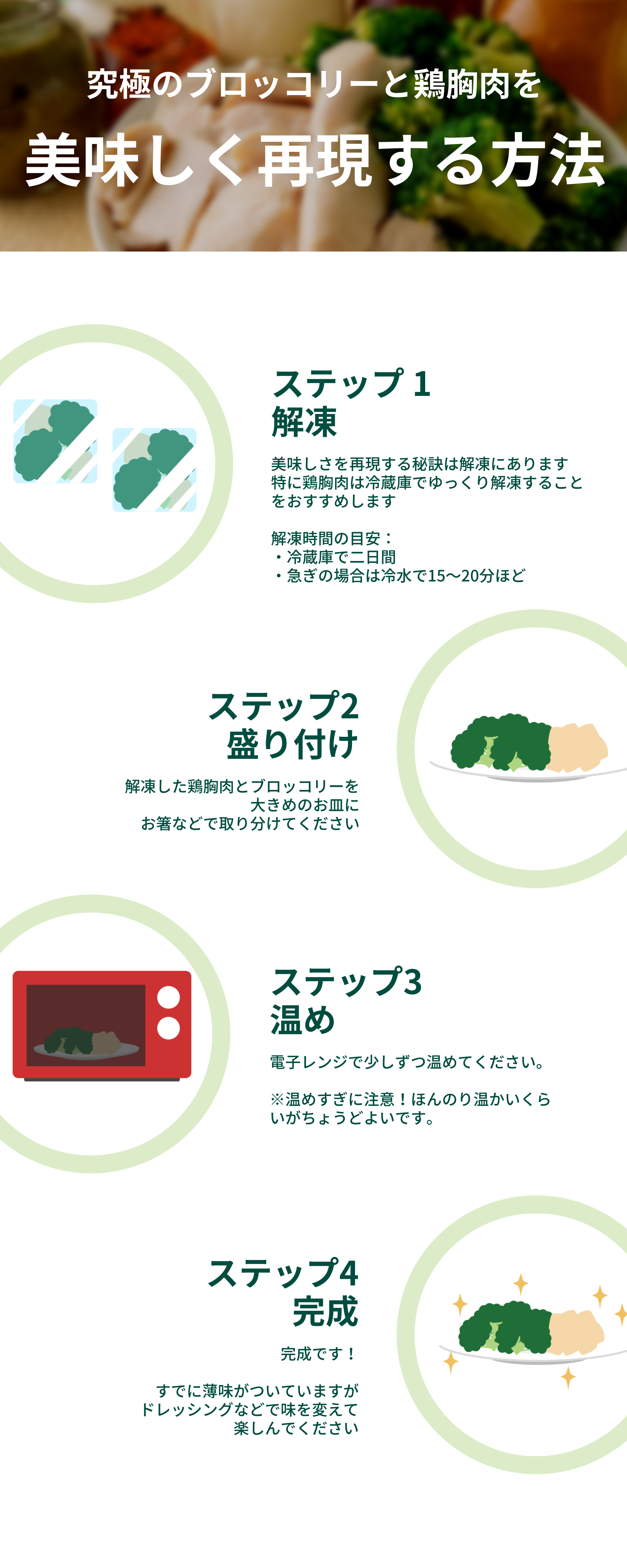 2021/08/14 19:05多くの方にご支援いただき、心より感謝申し上げます。今回は商品紹介3回目として、美味しく食べる方法のステップ3の温めから、ステップ4の完成を紹介いたします。解凍し、盛り付けた鶏胸肉とブロッコリーを温めていきます。※ステップ1〜2をご覧になっていない方はこちら開発中の商品紹介 ①解凍方法開発中の商品紹介 ②盛り付け方法【電子レンジで温める】解凍後、お皿などに盛り付けた鶏胸肉とブロッコリーに食品包装用ラップフィルムをかけ、電子レンジで温めます。温めの目安は袋半分の量で、600Wで30〜40秒です。時間は食材の温度などで変化します。ほんのり温かいくらいが、おすすめです。加熱が足りなければ10秒ずつ温めるなどして、温めすぎないように注意してください。【完成!】ふわふわで柔らかい鶏胸肉と、旨味があふれ出すブロッコリーをお楽しみください!すでに味もついていますので、そのままでも美味しくお召し上がりいただけます。お好みで下記のようなドレッシングと組み合わせることで、味の変化をお楽しみいただけます。塩コショウ・ポン酢・マヨネーズ・ごまドレッシング・チリソース・七味マヨネーズ など※オンラインショップ用商品にはドレッシングは付いておりません。ご了承ください。ぜひ、ご自宅にある色々なドレッシングなどで試してみてください! もっと見る
