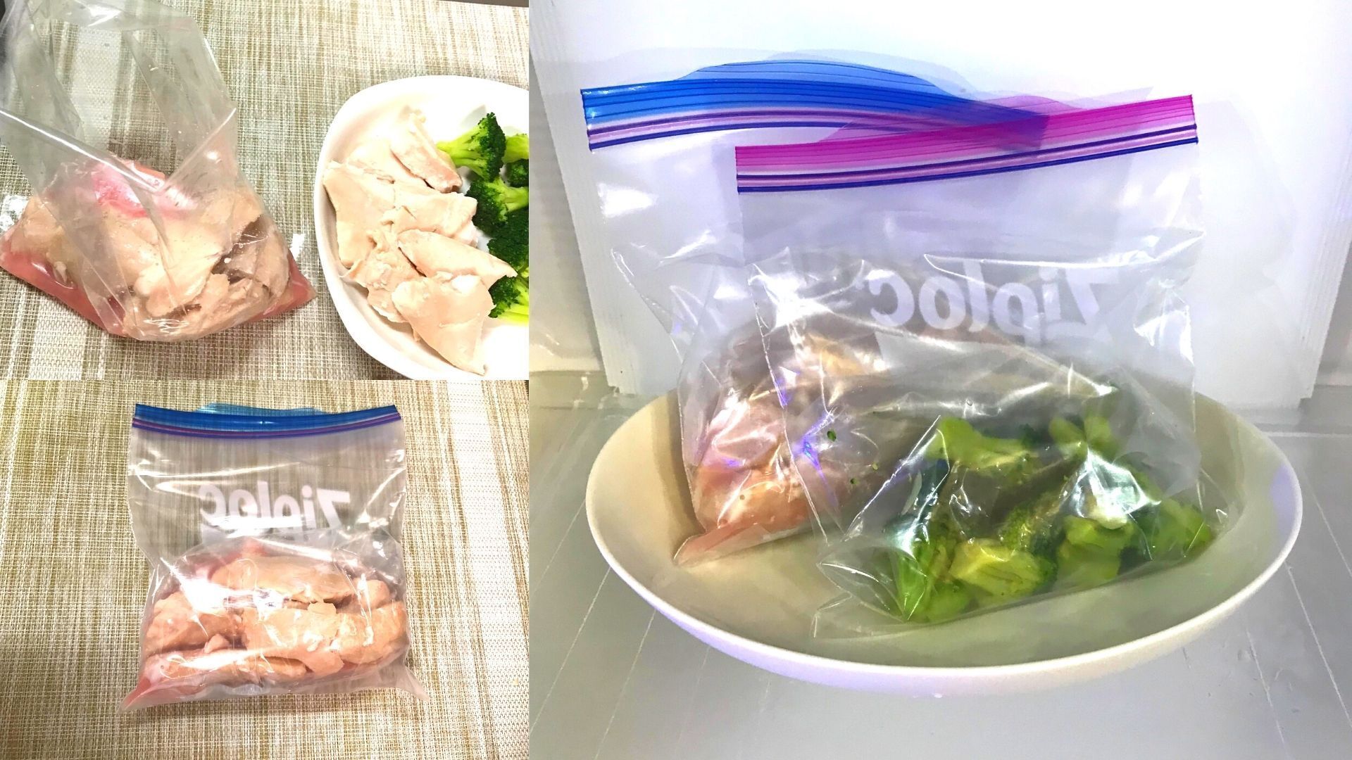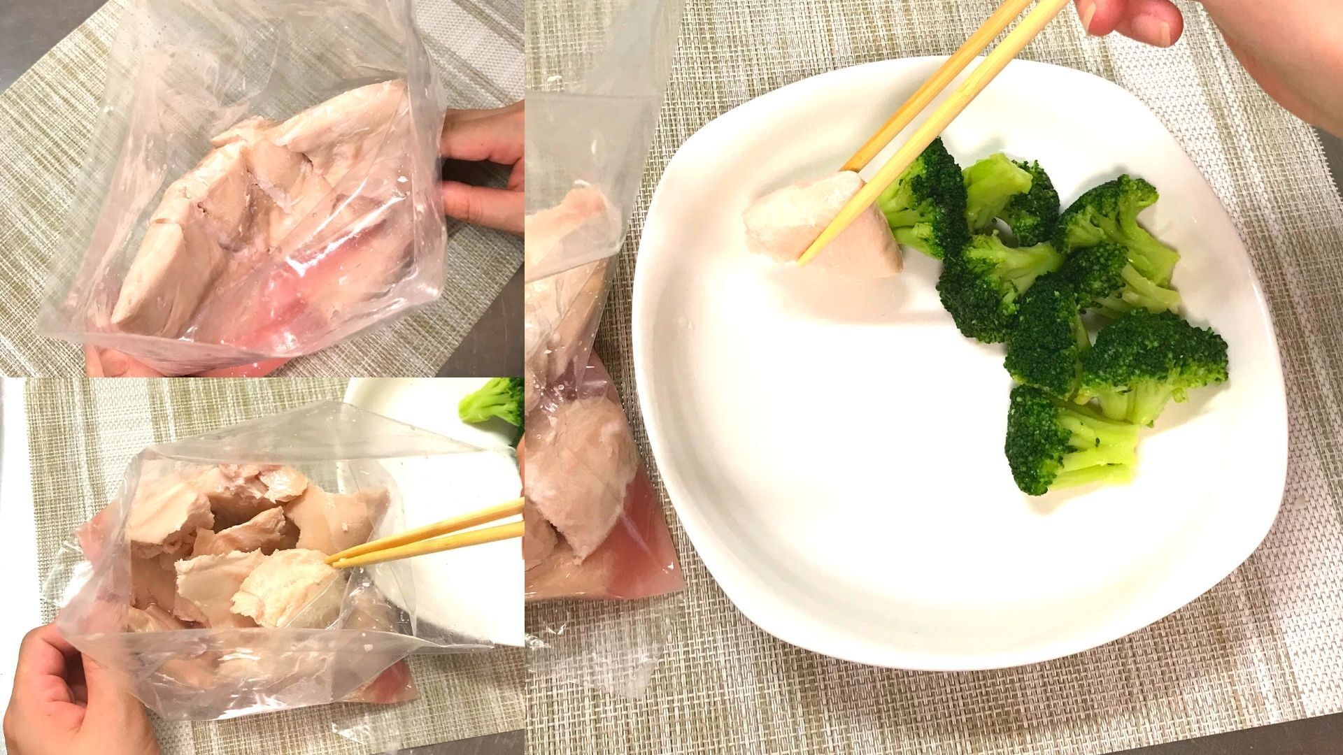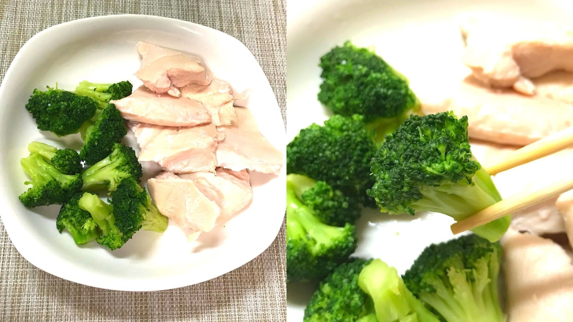解凍した鶏胸肉とブロッコリーを盛り付けていきます。