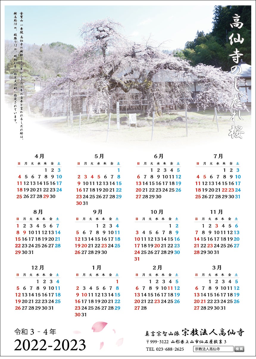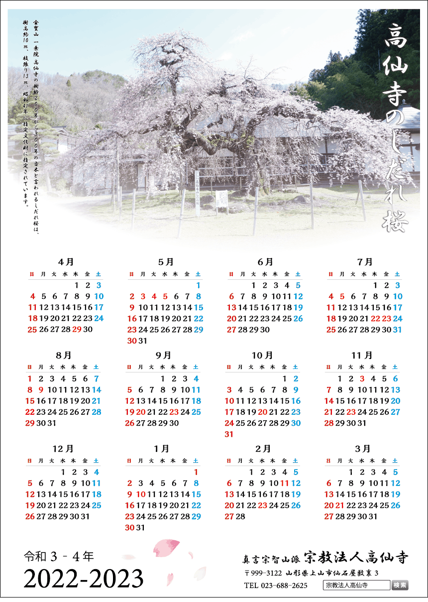 5,000円 高仙寺の桜の写真入り年間カレンダー A3サイズ+お礼のお手紙