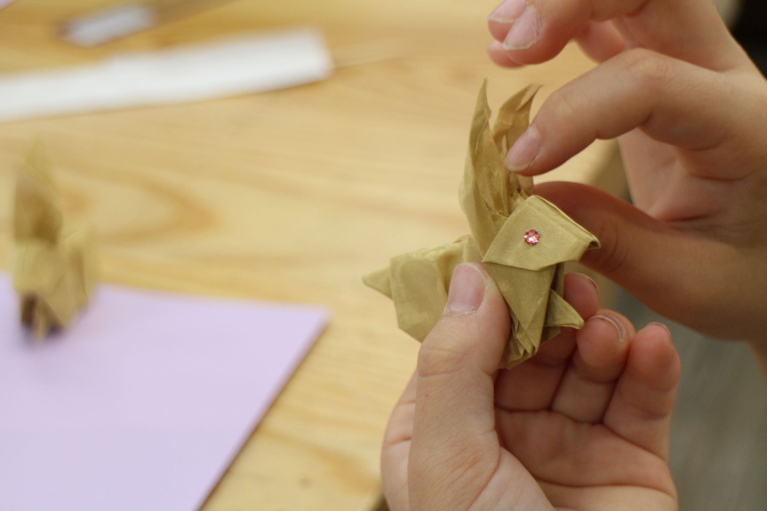 早くワークショップが開催できるようになってほしい。以前ワークショップで小学生がウサギを折りました。目にはキラキラを、接着剤で簡単につきます。