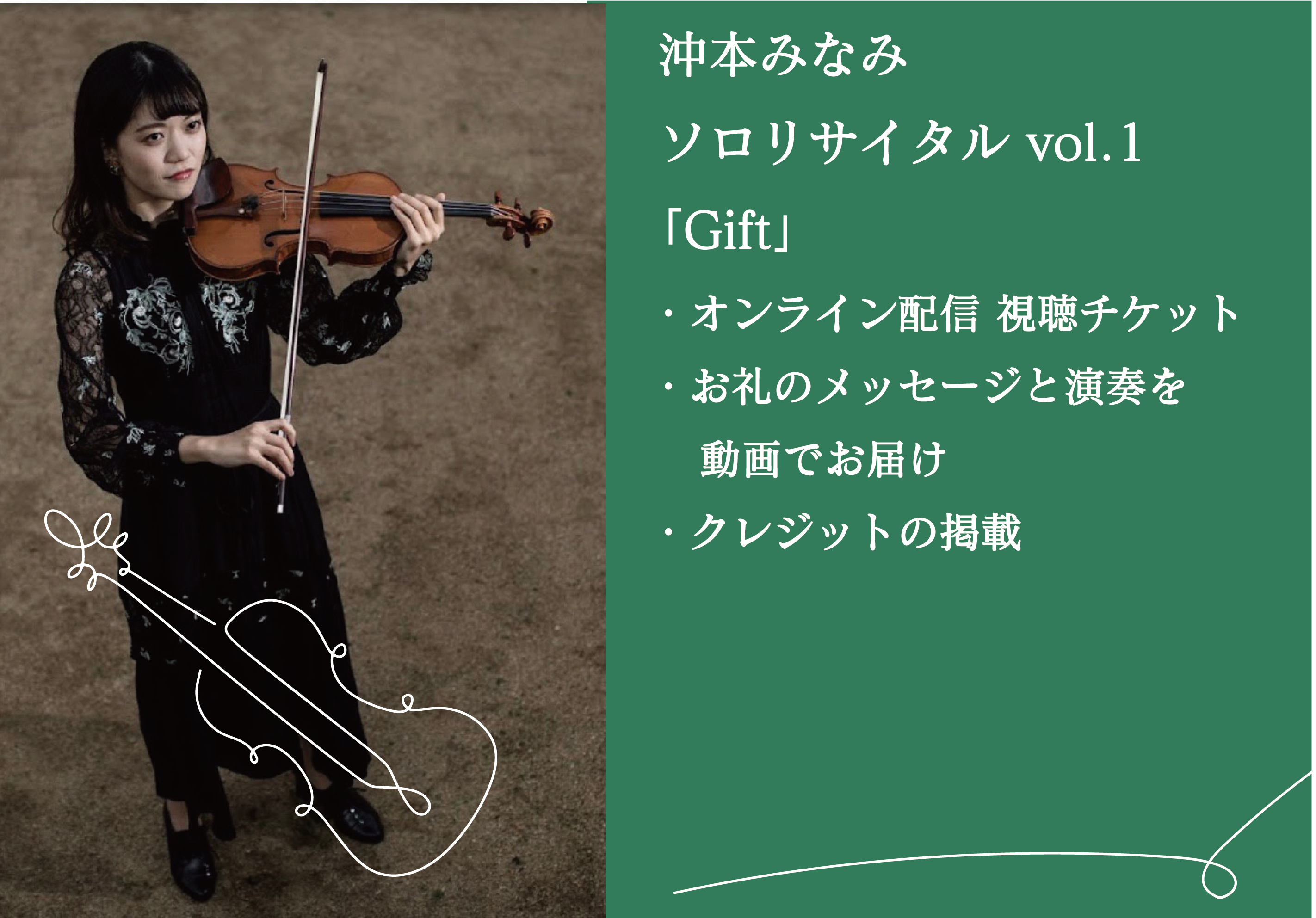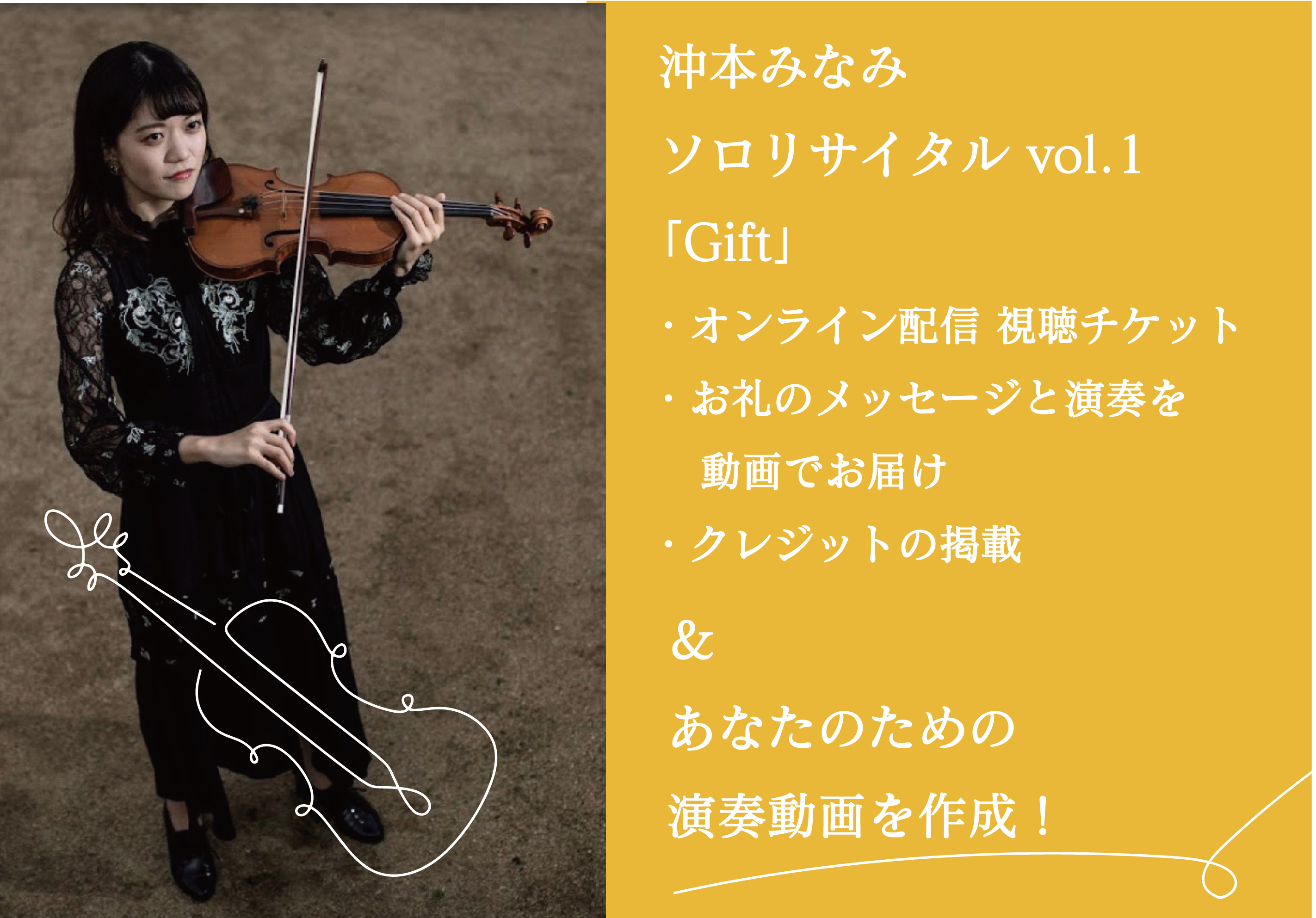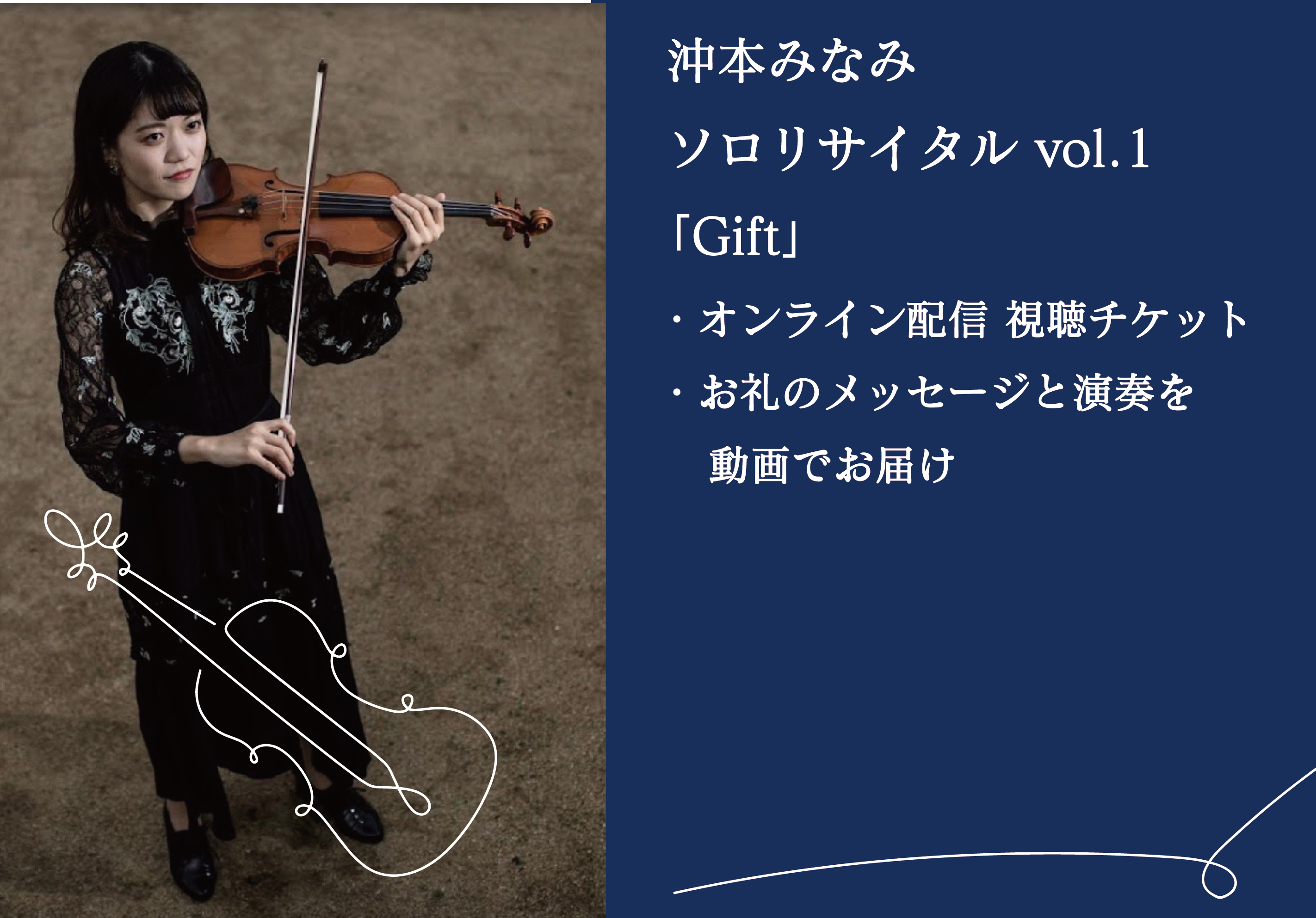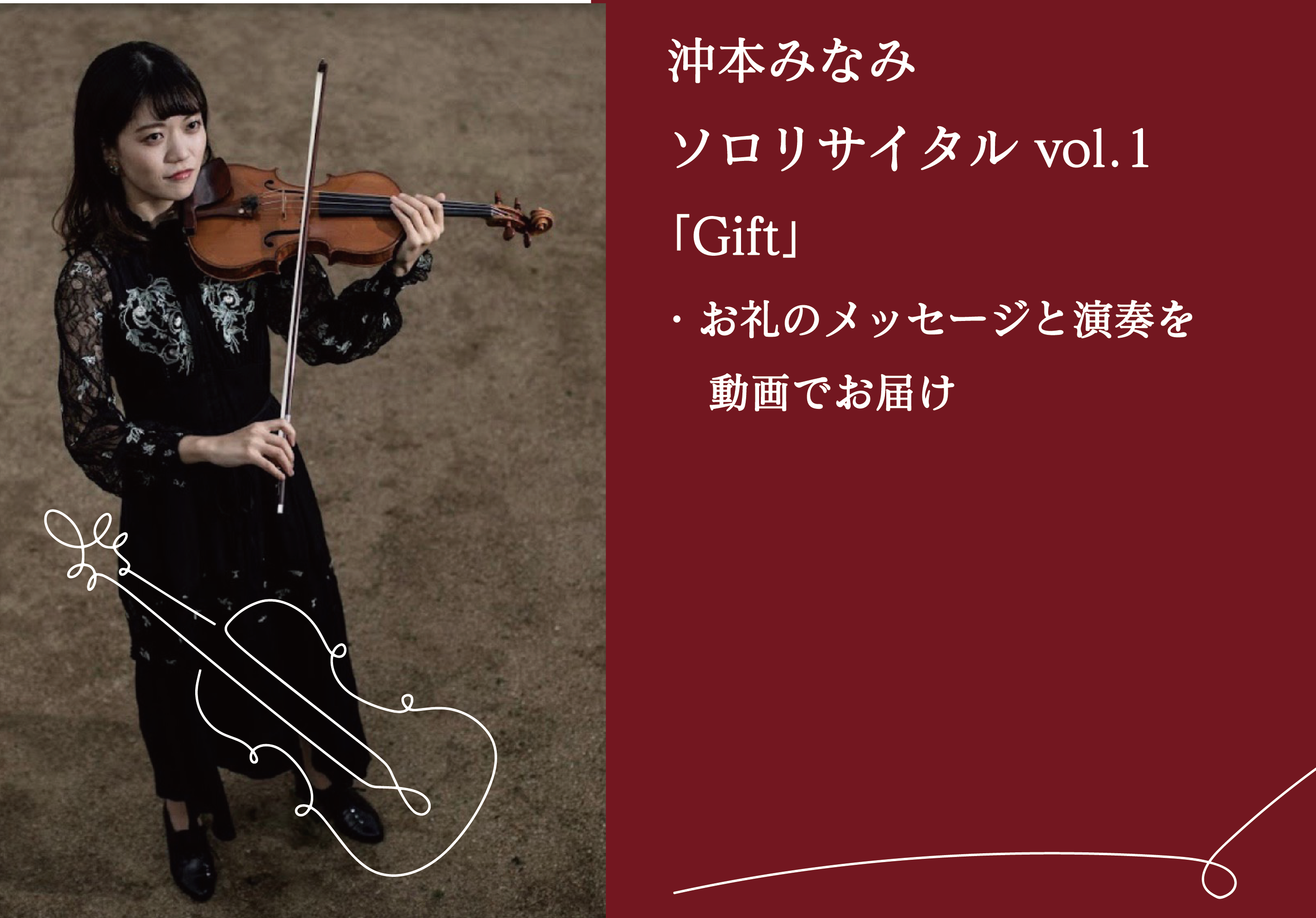 ヴァイオリニストの沖本みなみです。4歳の時に、テレビで見たオーケストラに憧れてヴァイオリンを始めました。大学生の頃から「クラシックをもっと身近に感じてもらいたい」という思いをモットーに演奏活動を行っています。