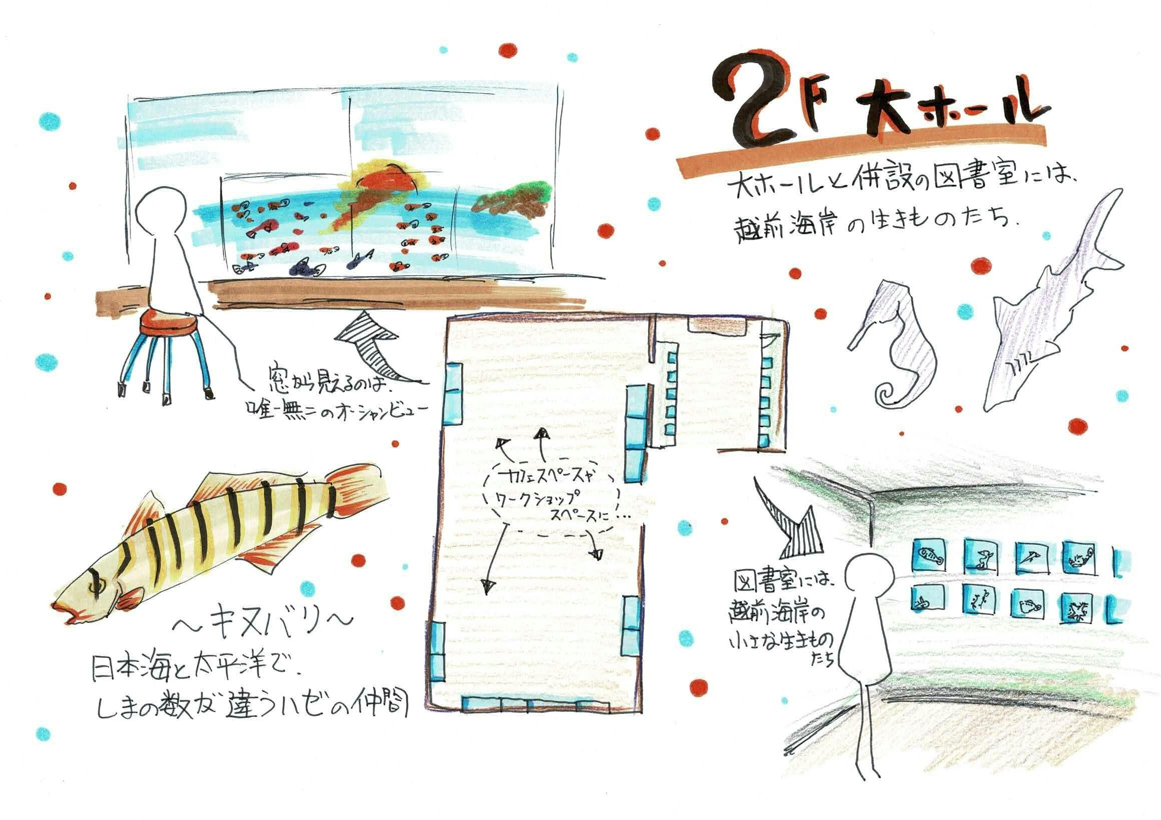 この大ホールと図書室には、基本的には越前海岸で見ることができる生き物しか展示しない予定です。