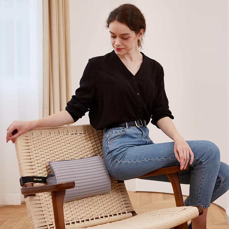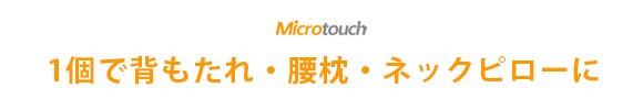 Microtouch多機能サポートクッションは、そのままの状態で腰枕として、バンドを利用して背もたれとして、そしてサッと丸めればほどよい高さのネックピローとして、3通りのスタイルに変身します。