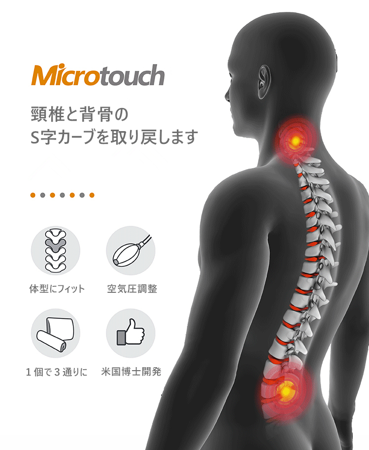 人間の姿勢に起因する健康上の悩みという、恒常的で難しい課題に挑戦するため、Microtouch多機能サポートクッションは米国の大手医療グループKaiser Permanenteの医学博士とのコラボレーションにより、人体工学に基づく頸部、腰部のサポート設計を開発。