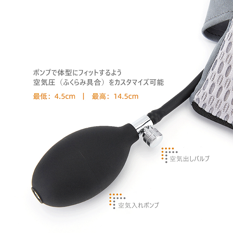 首や腰のカーブの形状は人によって異なるため、ポンプにより空気圧を操作し高さを調節できるメカニズムを採用(4.5~14.5㎝)。