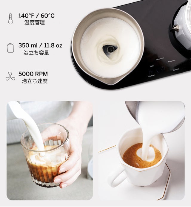 自動泡立て設計により、手軽なミルクの泡立てが可能、様々なミルクドリンクを楽しむことができます。正確な温度管理でミルクが焦げることを防ぎ、ミルク本来の甘さをそのままに表現します。毎分5000RPMの高速回転するスクリュー技術により、滑らかなミルクフォームを生み出します。