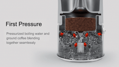 通常エスプレッソメーカーは、押し固めたコーヒーの粉に高圧をかけたお湯を通す事で、圧力で絞り出す様な感じで少ないコーヒーの粉で濃いエスプレッソと呼ばれるコーヒーの抽出液を滲出させます。