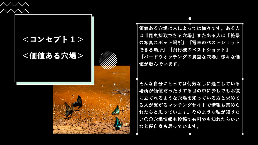 他には、これからやっていく地域起こし協力隊で繋がる事業の方々の企画も考えて、キャンプファイヤー様で企画を立ち上げて資金を募り”穴場情報サービス”で「魅力ある穴場として紹介をしていきたい」と考えています。また当サービスに関して収益のマネタイズの仕組みも考えてたので、雇用も生まれたらとても地域のお役に立てれるのでは?と考えました。