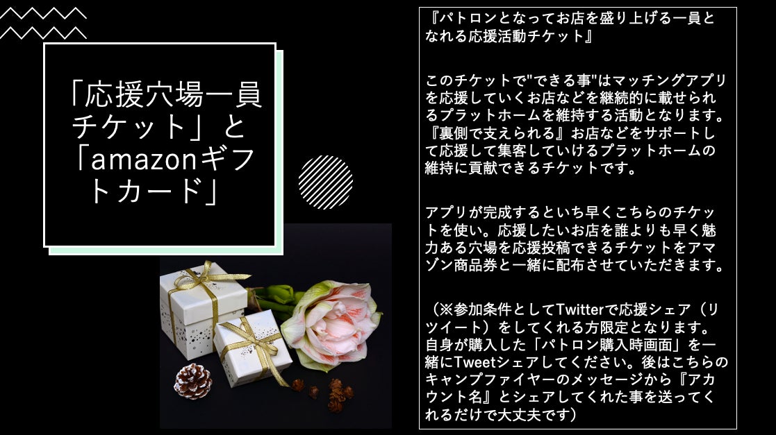 アプリが完成するといち早くこちらのチケットを使い。応援したいお店を誰よりも早く応援投稿できるチケットを配布させていただきます。お返しが『アマゾンギフトカード』になります。