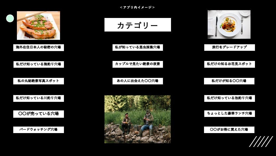 アプリ内では寄せられた多くの情報を求むデータを参考に『穴場情報リクエスト』のリクエストが多いカテゴリー一覧を設計していきます。