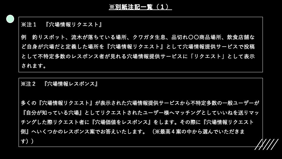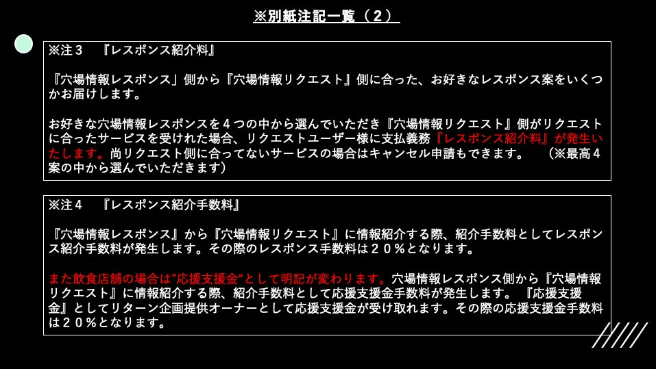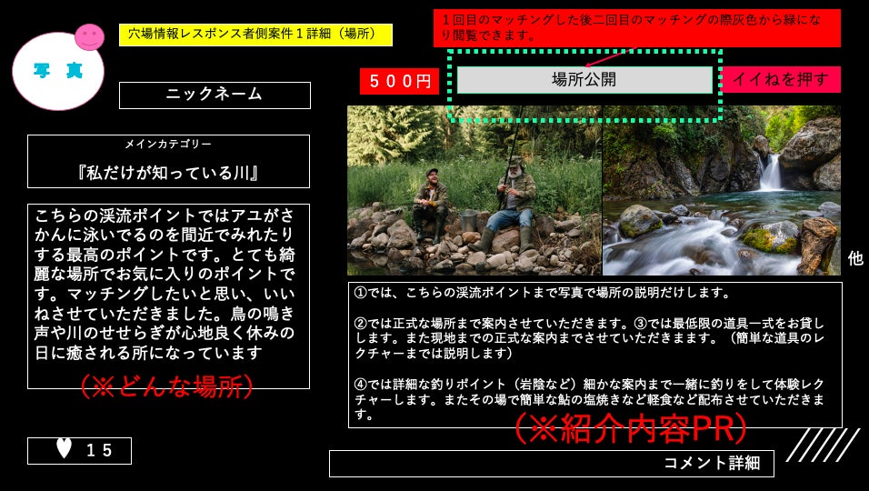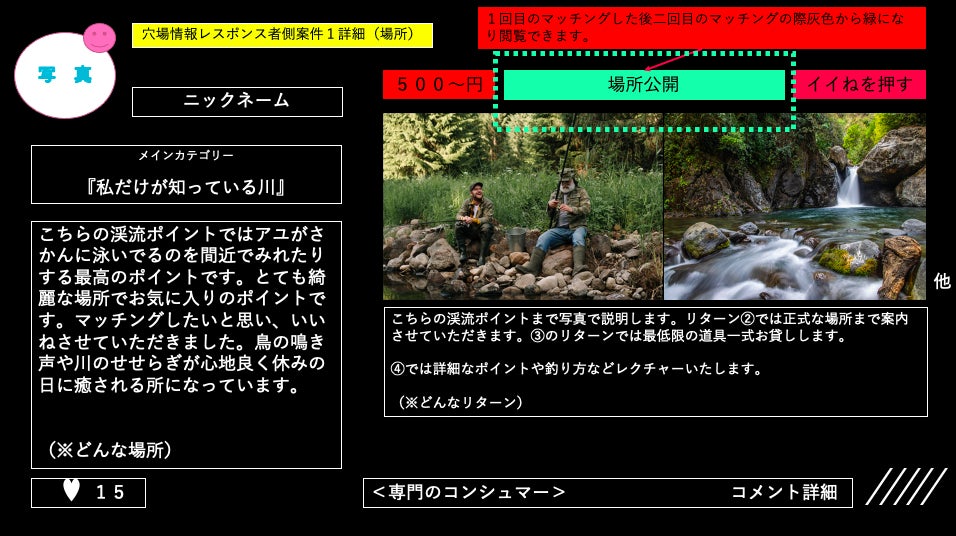 場所の正確な位置表示まではリクエスト側が求められたのち、穴場情報提供者側が2回目のマッチング(承諾)した際にリクエスト側がリクエストに合った情報交換(モノ)と判明した時点で紹介料が支払われます。(※キャンセル申請可能)最後に緑の枠が緑に変化して2回目のマッチングが行われます。