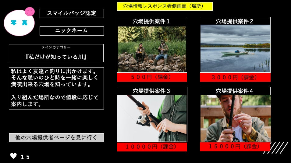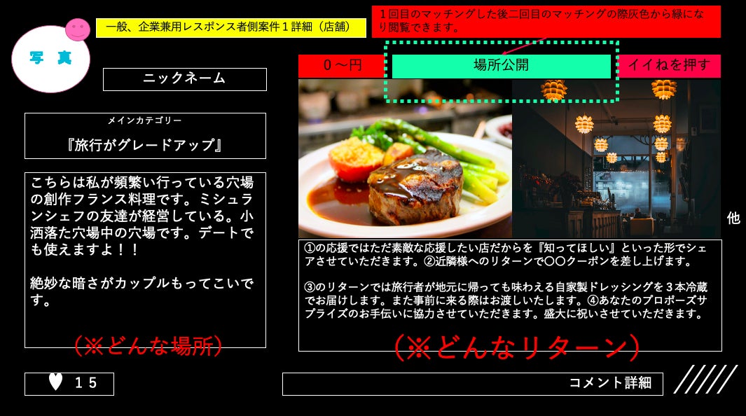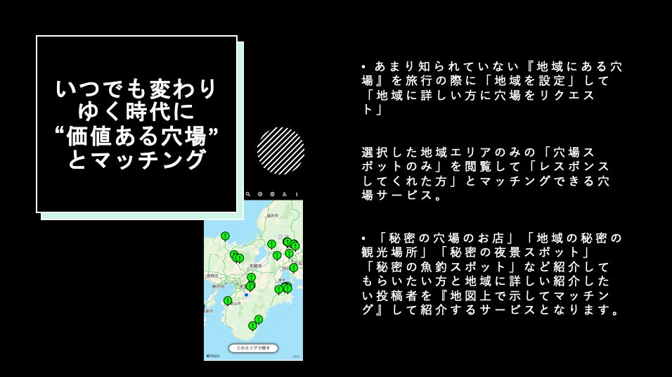 投稿者を『地図上で示して地図上でマッチング』して旅行の際には“知る人ぞ知る極上の穴場”でデート穴場も知ることができる課金型リクエスト穴場マッチングサービスです。いち早く有名になる前にあなたに穴場をお届けします。