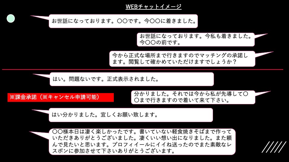 ※キャンセル申請についてお互い同意の上キャンセル申請となります。キャンセル申請に同意ない場合はキャンセル不成立となります。不成立となった場合チャットメッセージは利用不可となり穴場サービスまでの『お問合せフォーム』が表示されます。
