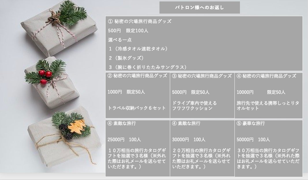 集まったご支援金は『専門サイト設立』『活動資金』『CAMPFIRE手数料』『CAMPFIRE決済料』『パトロン様のリターン』として使わさせていただきます。極上旅行の思い出となるサービスを構築して行きたく思っております。