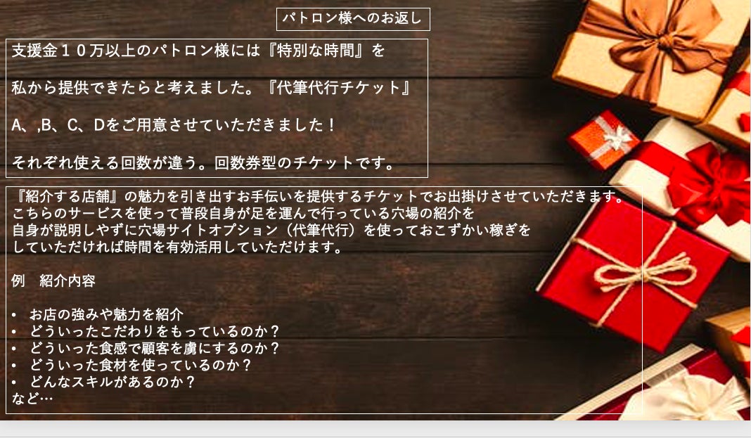 <お店のパトロンとなってお店を盛り上げる一員となれる応援活動チケットA、B、C>
