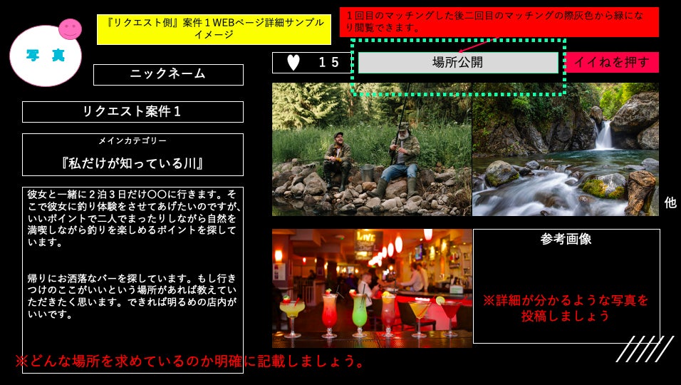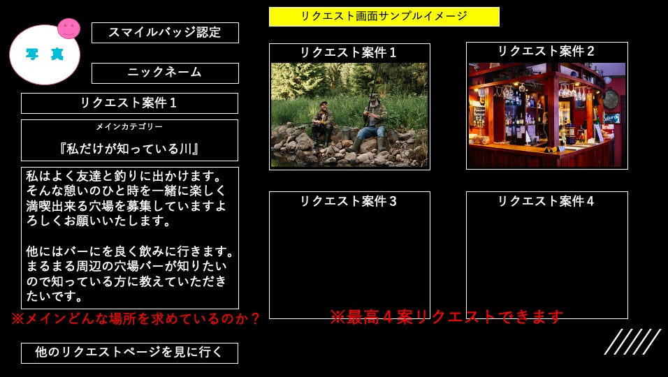 まずは『私のリクエスト』といった形で個人個人の穴場リクエストを集める”WEB専門サイト”を作って最終的にはそのリクエストに応えられる『不特定多数のレスポンス』とのマッチングを考えております。