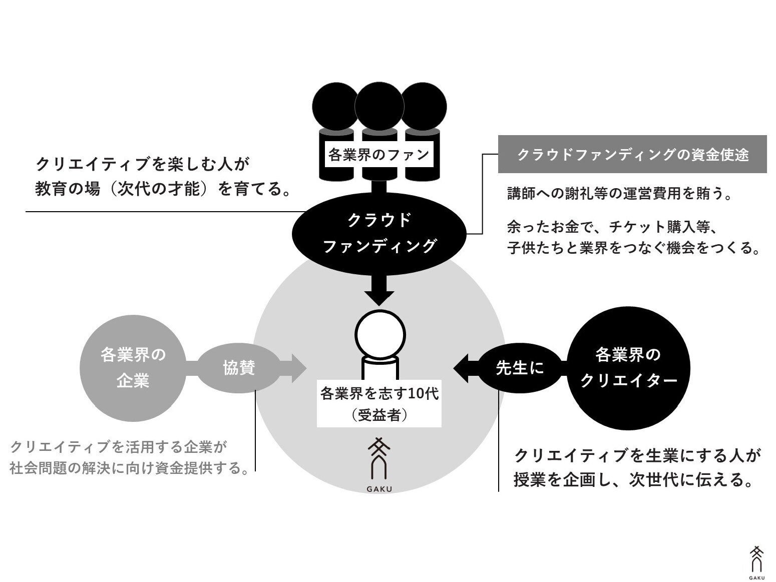 公教育において、様々なジャンルのクリエイティブ教育を行うことは困難です。GAKUでは、クラウドファンディングの力で、演劇で人生を豊かにしてもらった人たちが、自ら、未来の業界を支えていく次世代を育てる仕組みが作れるのではないかと考えています。演劇ファンの方が、クラウドファンディングを元手に子供たちを支援し、演劇業界のクリエイターが講師として子供たちと向き合っていきます。