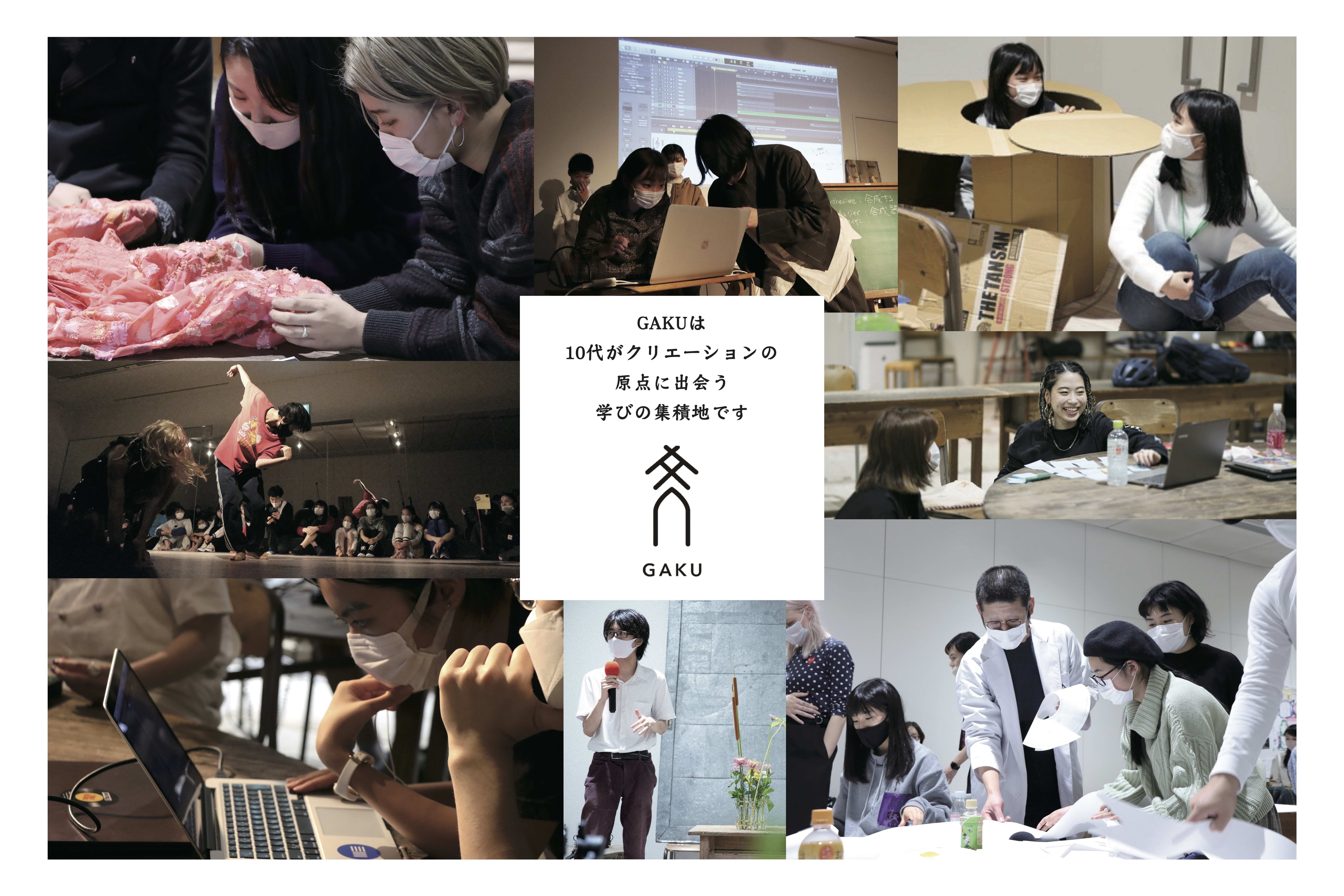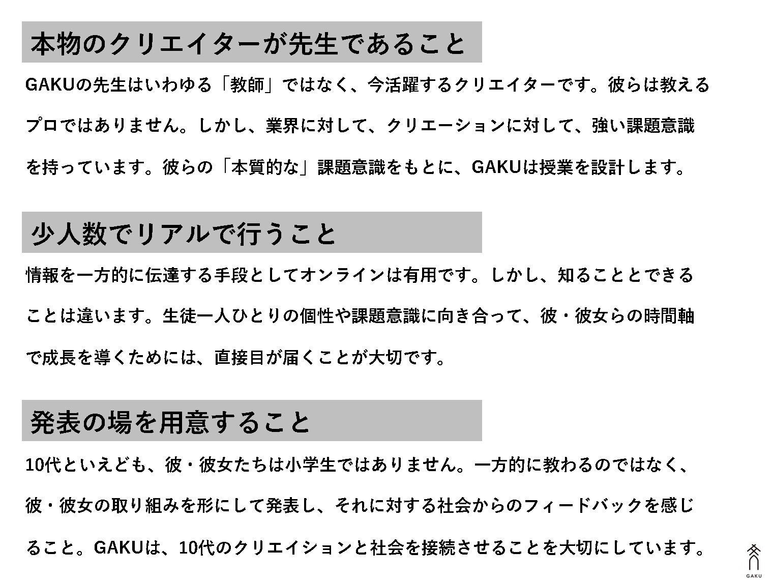 もし、この敏感な時期に、彼ら・彼女らが、「本物の」「一流の」クリエイターに出会い、色々なことを吸収できたら?無限の可能性を秘めた10代が、クリエイターとともに、試行錯誤を重ね、創造性を育みながら仲間になる。そして、10代がこの閉塞した日本社会を変えていく。GAKUが目指しているのは、そういうワクワクする世界です。